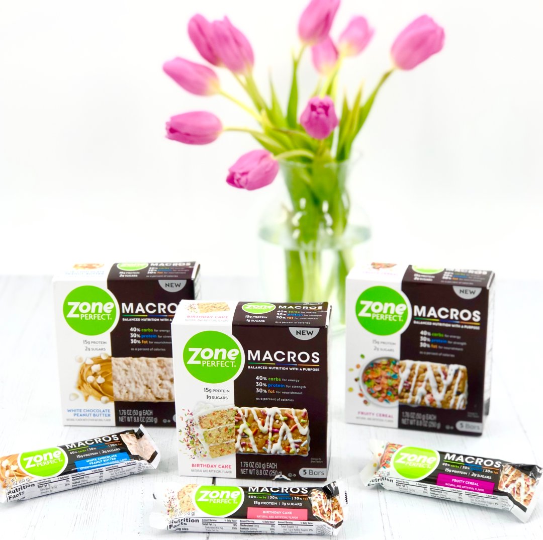 I was thrilled to discover the ZonePerfect Macros Bars at Walmart! They come in three amazing flavors: Birthday Cake, White Chocolate Peanut Butter and Fruity Cereal. Often times, I have to eat on the run, so I keep a few in my purse and gym bag for a pre or post workout snack. I love that they contain a ratio of 40% carbs, 30% protein (15 grams) and 30% fat as a percent of calories. They have just 1 to 2 grams of sugar and have a whopping 18 vitamins and minerals in each bar.