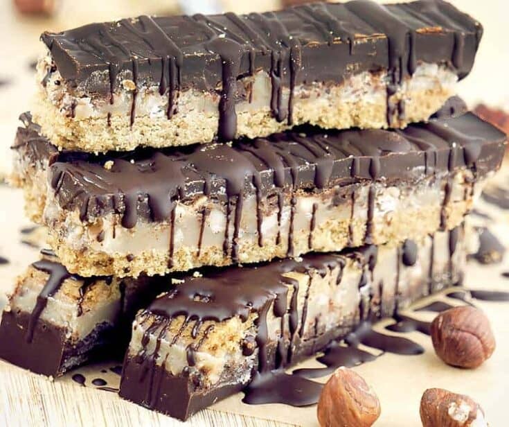 This vegan caramel slice recipe consists of a golden brown gluten free shortbread crust, a delicious chewy caramel, crunchy hazelnuts and a rich dairy free chocolate coating.