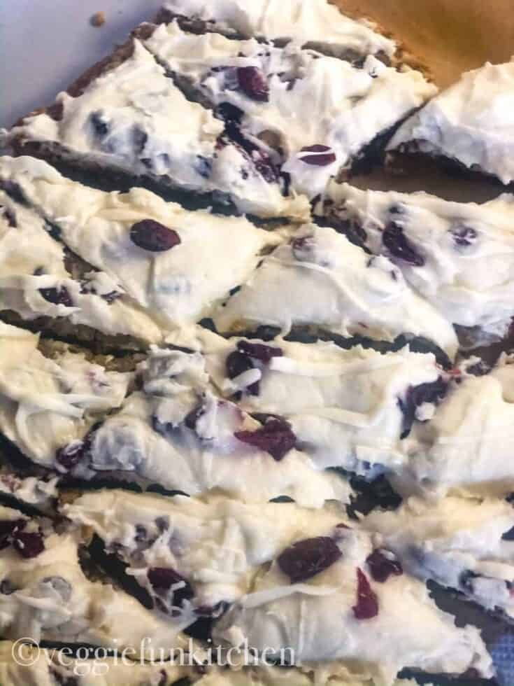 Vegan cranberry bliss bars. A copycat recipe that tastes just like the original you can find in a coffee shop.