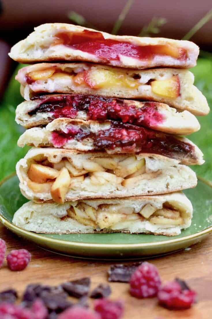 Fluffy, crisp pizza crust with a sweet delicious filling! These vegan dessert calzone are fun to make and super tasty to eat. http