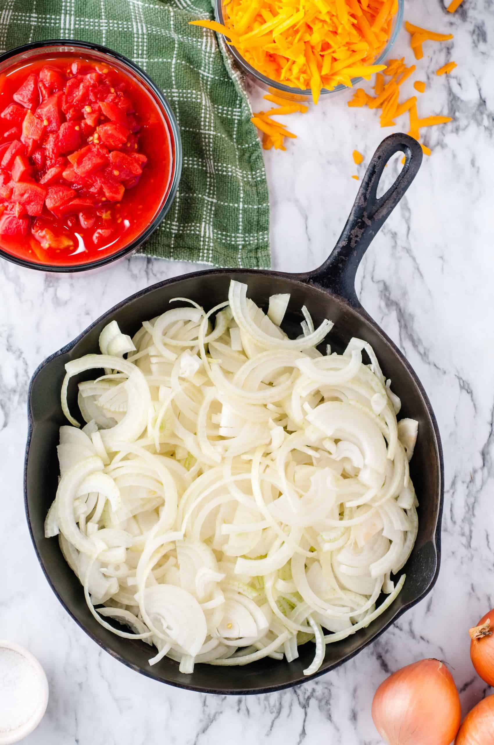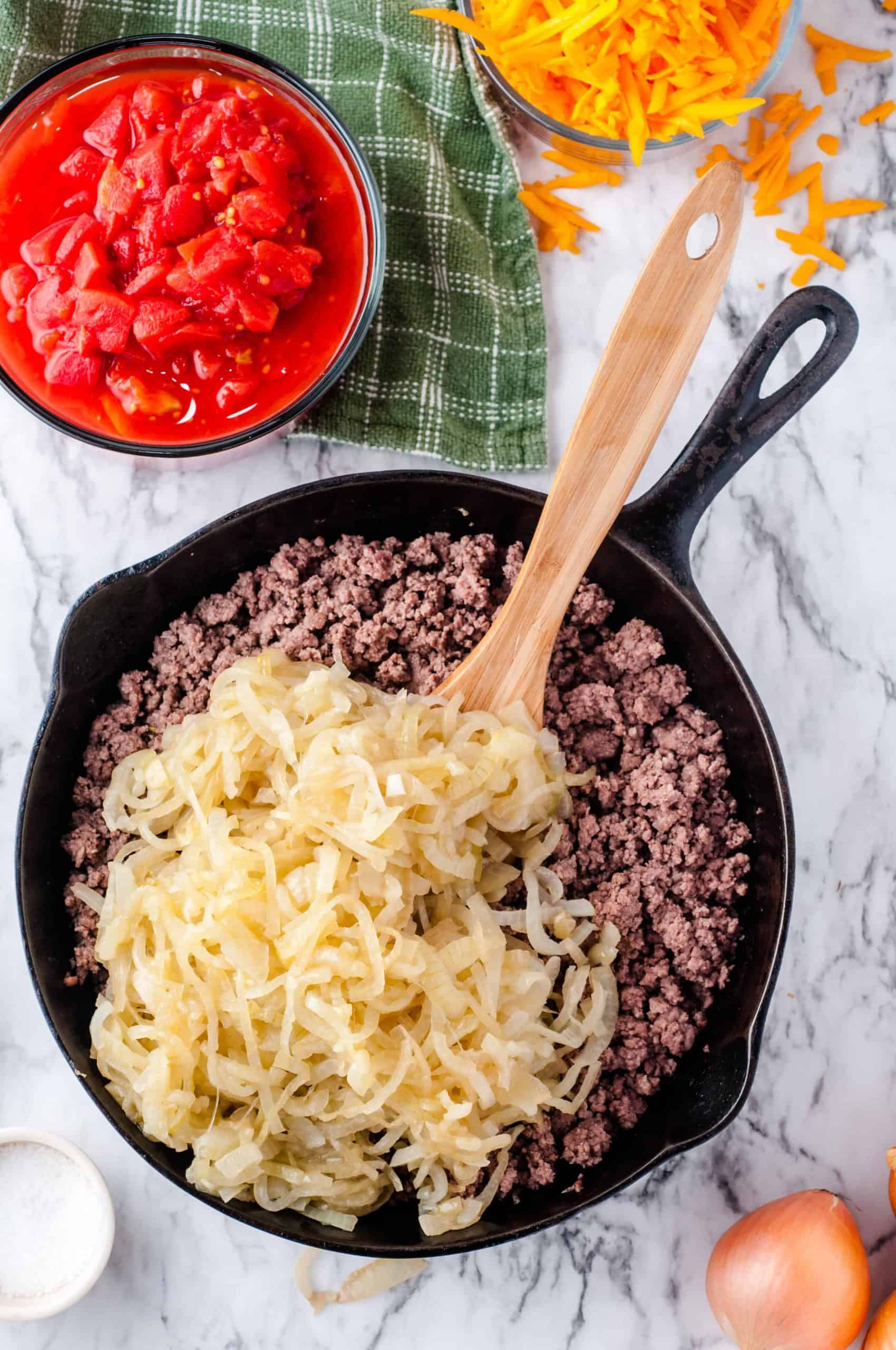 - Add the onions back to the skillet with the beef and mix together cooking for an additional 3 minutes.