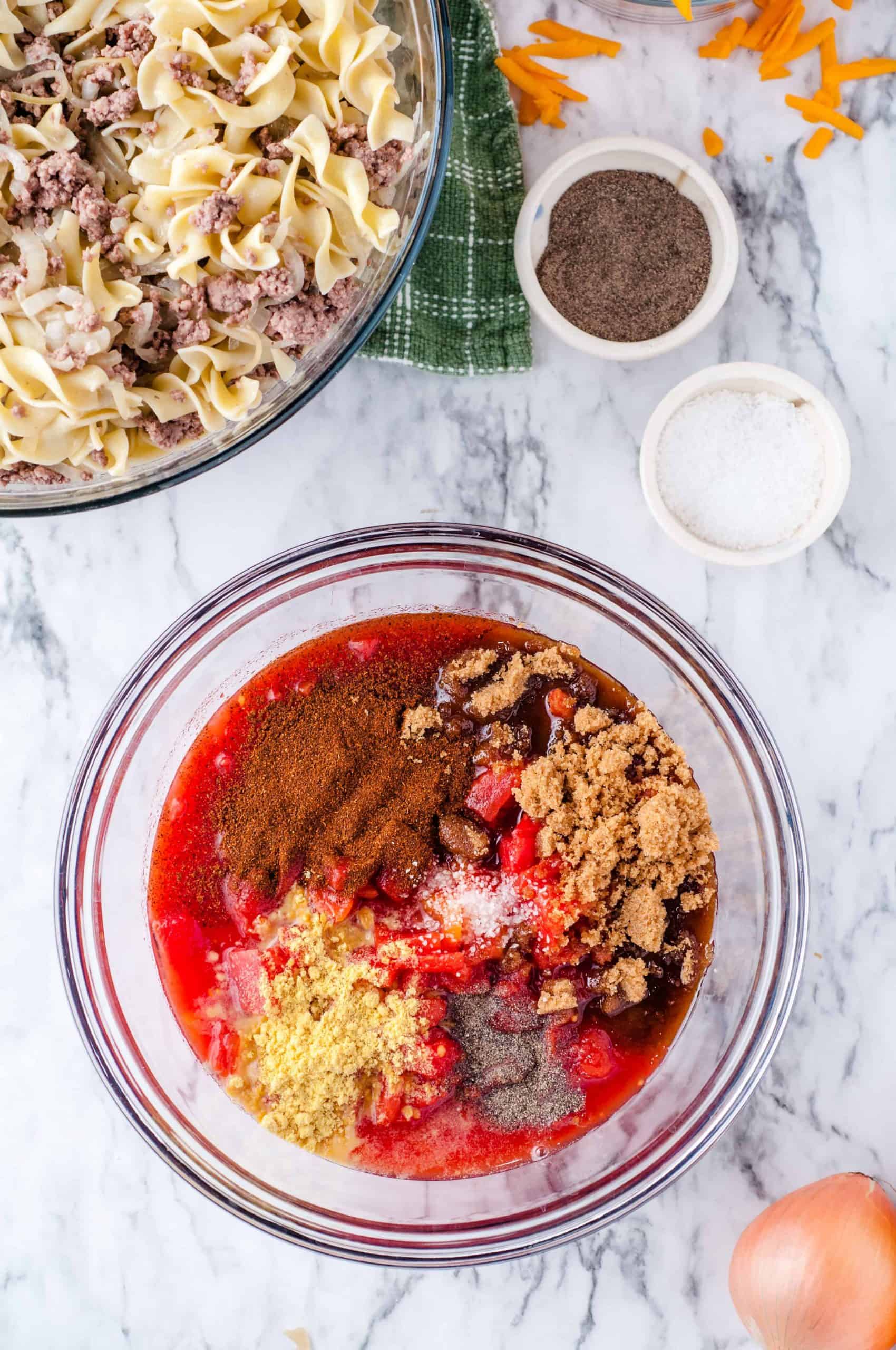 - Put the egg noodles in a large bowl and add the ground beef/onion mixture.