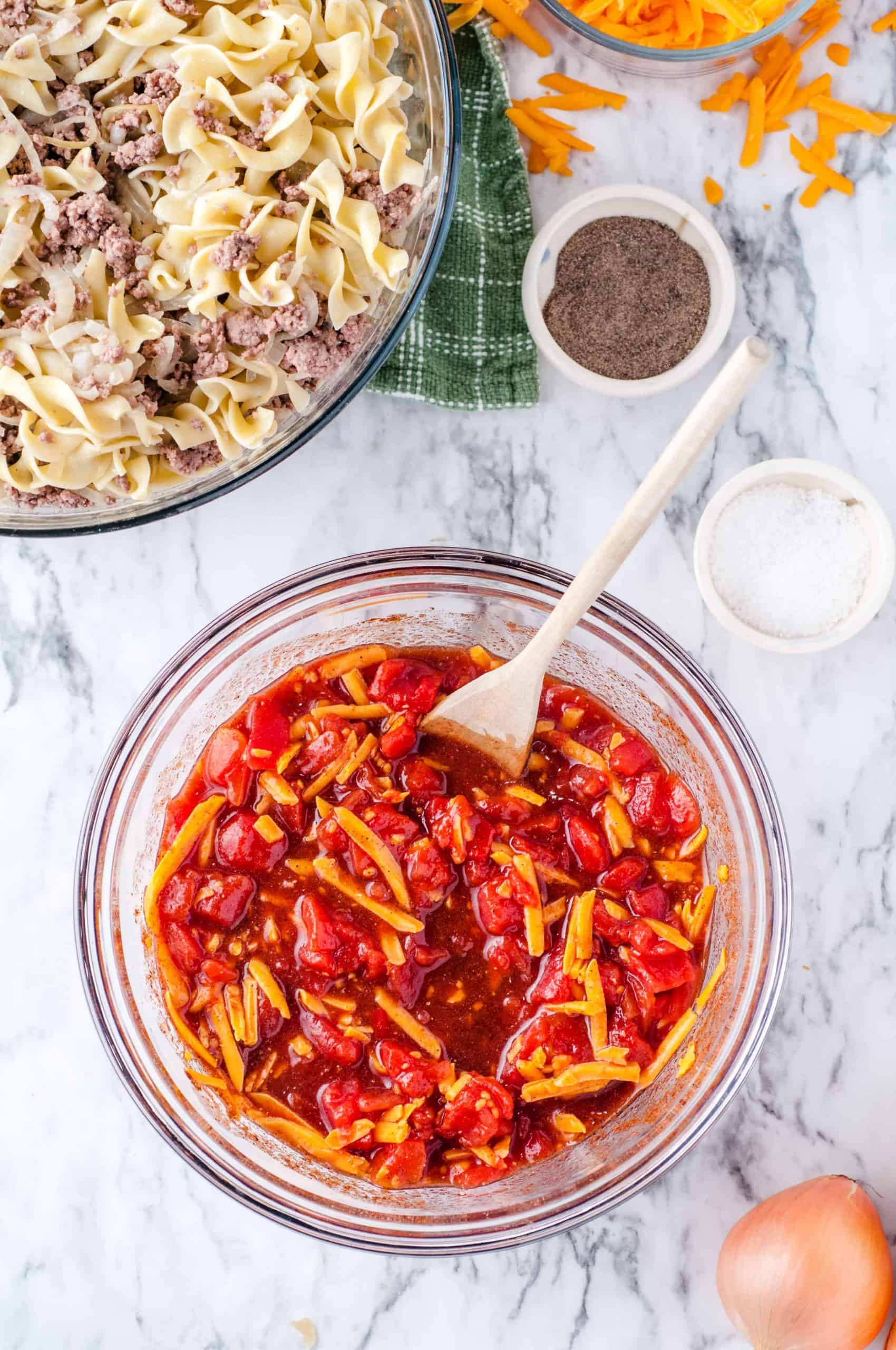 Pour the tomato mixture over the noodles and stir gently. Put the noodle mixture into the prepared baking dish and sprinkle the remaining cheese on top.