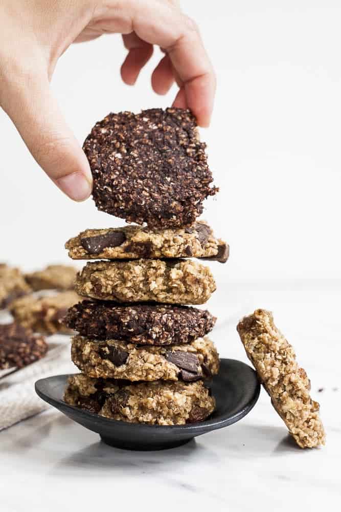 These healthy oatmeal cookies are made with almond flour, oats, almonds, chia and flax seeds and are sweetened with Medjool dates and pure maple syrup.