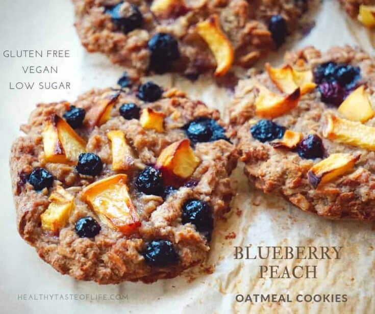 These healthy gluten free vegan oatmeal cookies are full of juicy ad fresh blueberry, peach and maple flavor, with a crispy crust and chewy inside.