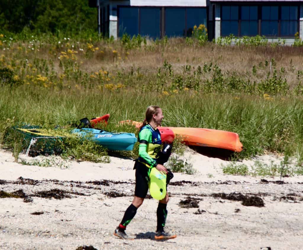 Next up, was the last swim of the day and I was feeling relieved! First, I ran on the beach to make it to the water. There were several people warning everyone of the ripping tide between the islands. They were right, the tide was so strong that one of my paddles flipped on my hand. I stopped to adjust it and held on to a boat anchor rope while doing so. As I hung on, my body was being pulled from the rope. I was only 20 yards from shore, so I angled my swim to the right of the beach and ended up at the far left side of the beach when I made it!