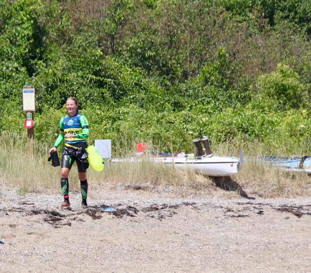 The course started with a 2 mile run on a dirt road down to the beach followed by about a 600 yard swim over to Vaill Island. Vaill Island proved to be a challenge again on race day to traverse, especially since I had all the equipment with me. However, I made it through and was happy to get back into the water.