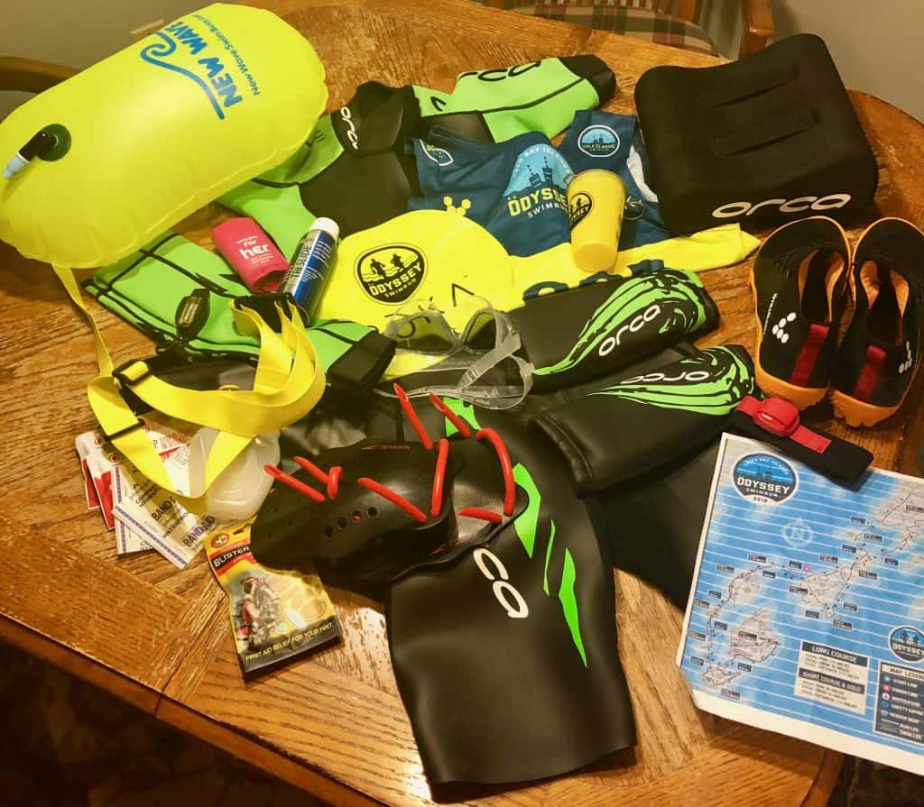 There is some required equipment: a compass or GPS watch, a pressure dressing, and a swim buoy (for the solo event). Then, there are several optional items that can be used.