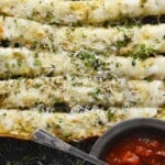 Place the pan back in the oven and cook under the broiler for one to two minutes, until the cheese is melted and golden brown in spots. Remove the pan from the oven and top with fresh parmesan cheese and parsley. Cut the loaf into breadsticks and serve warm with marinara sauce for dipping.