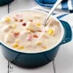 Serve the Chicken Corn Chowder topped with crumbled bacon and enjoy!