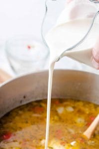 To finish up the chicken corn chowder, reduce heat and allow to simmer, partially covered, for 5 minutes. Whisk in the tapioca and simmer for 2 minutes until it begins to thicken. Stir in the heavy cream and allow to simmer 15-20 minutes, until potatoes are tender.
