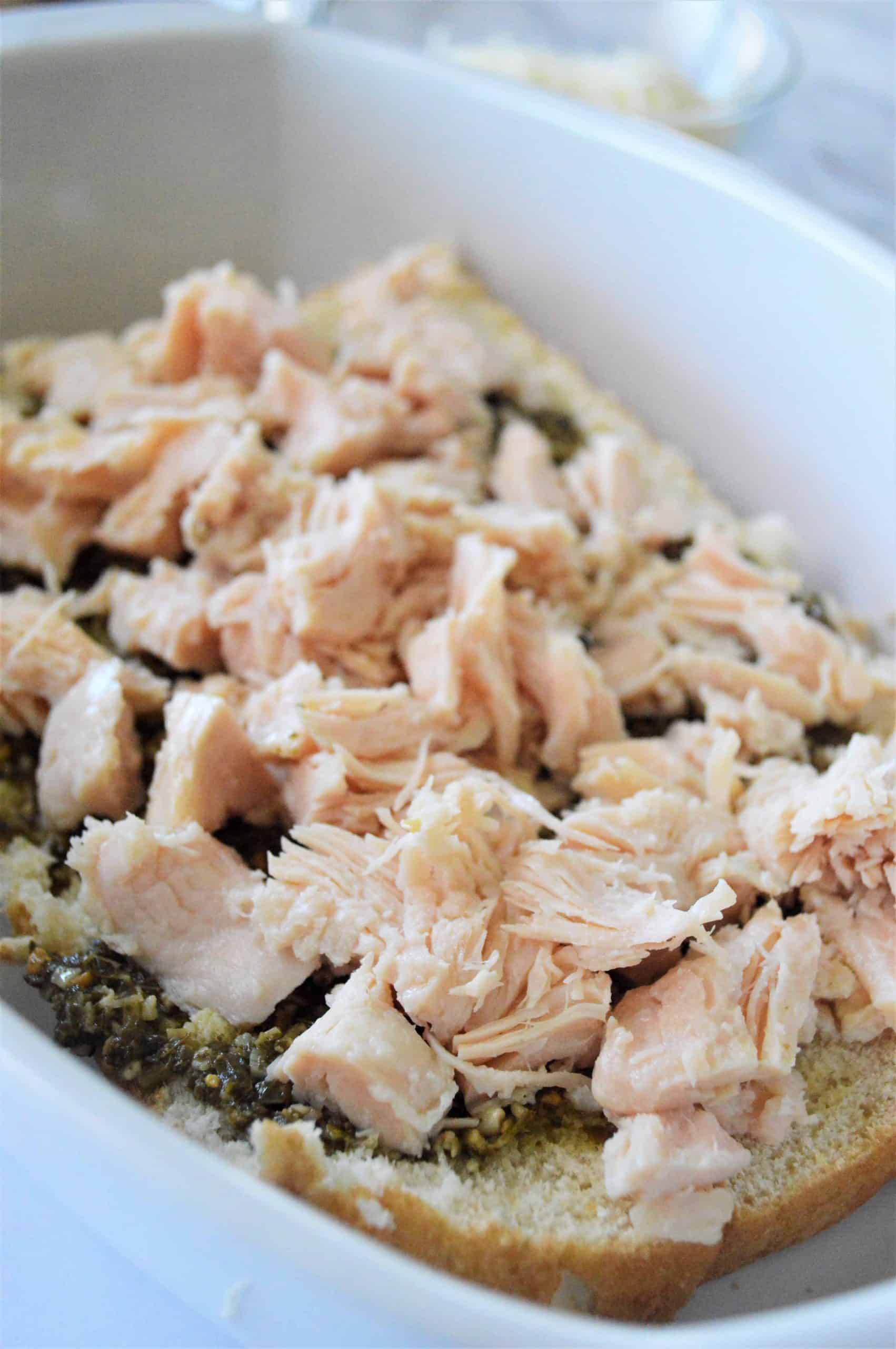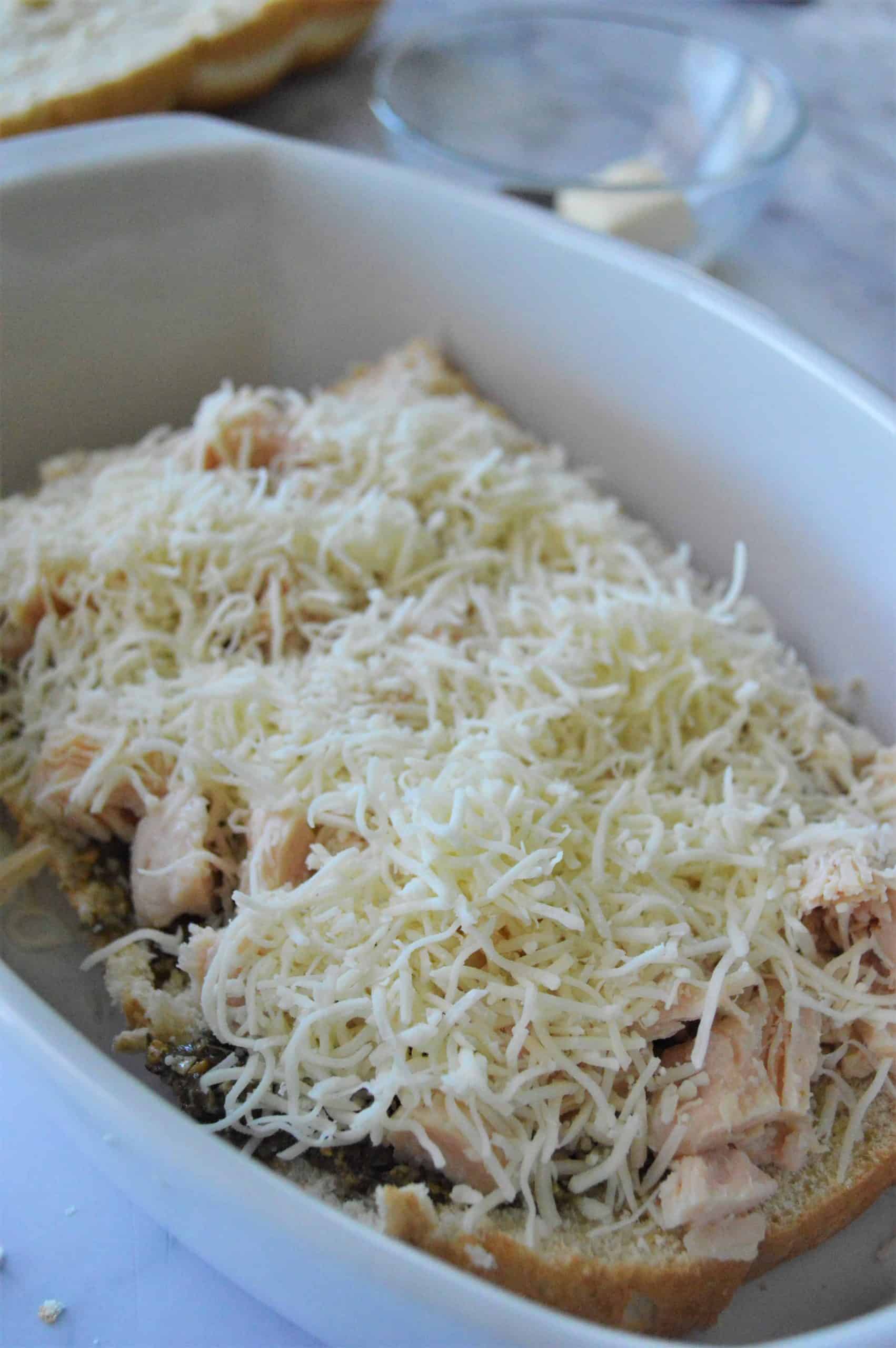 Spread pesto evenly over the buns. Top with shredded chicken and mozzarella cheese.