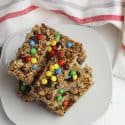 Line an 8x8 baking pan with parchment paper. Pour the oat mixture into the pan and press the mixture down into the pan until solid. Top the oat mixture with additional chocolate chips and chocolate candies. Press the candy into the top of the mixture to secure it in place. Place the granola bars in the refrigerator to cool for at least an hour. Before serving, remove the granola bars from the pan by pulling the edges of the parchment paper. Place on a flat surface and use a sharp knife to cut the granola into 10 bars.