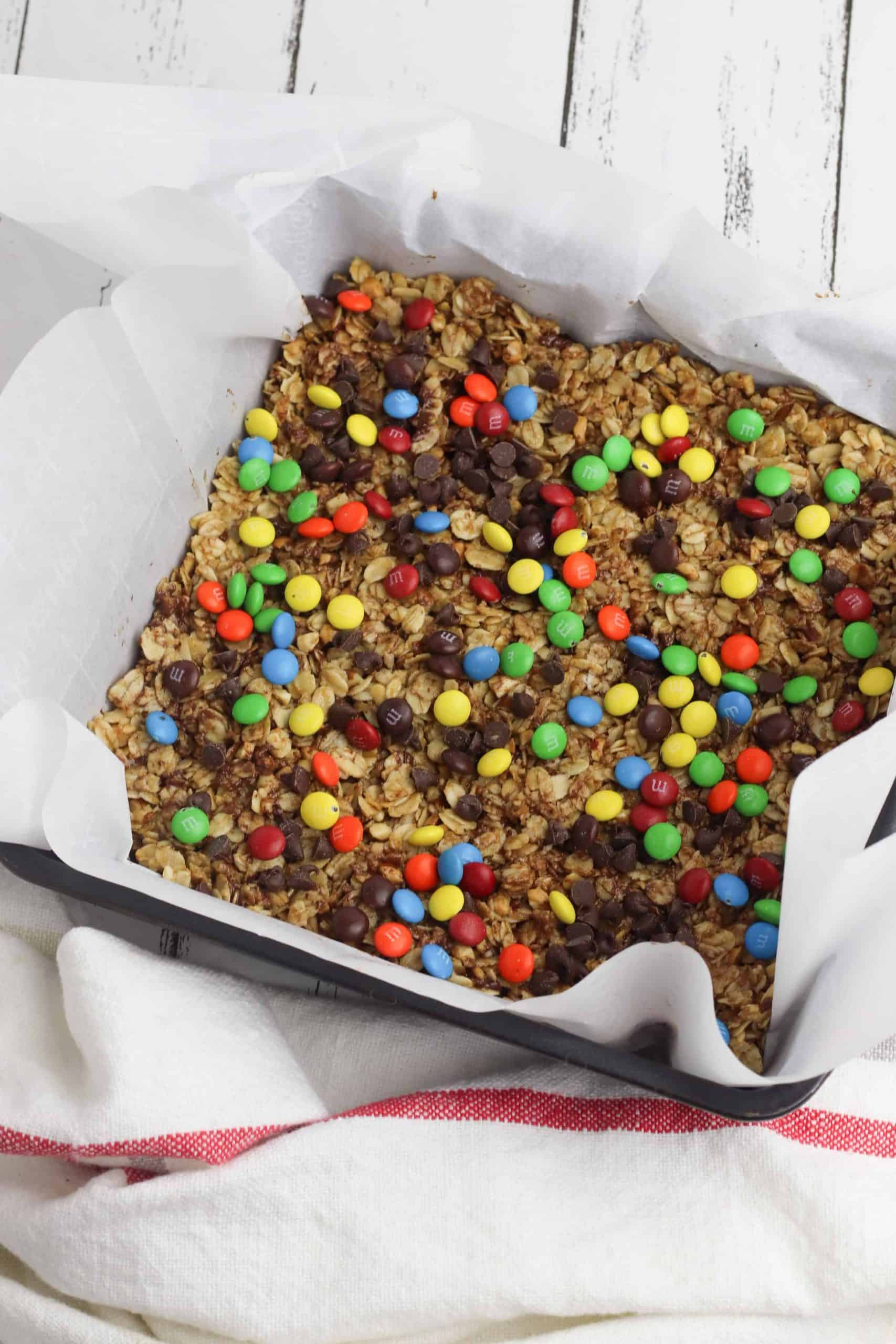 Line an 8x8 baking pan with parchment paper. Pour the oat mixture into the pan and press the mixture down into the pan until solid. Top the oat mixture with additional chocolate chips and chocolate candies. Press the candy into the top of the mixture to secure it in place. Place the granola bars in the refrigerator to cool for at least an hour. Before serving, remove the granola bars from the pan by pulling the edges of the parchment paper. Place on a flat surface and use a sharp knife to cut the granola into 10 bars.