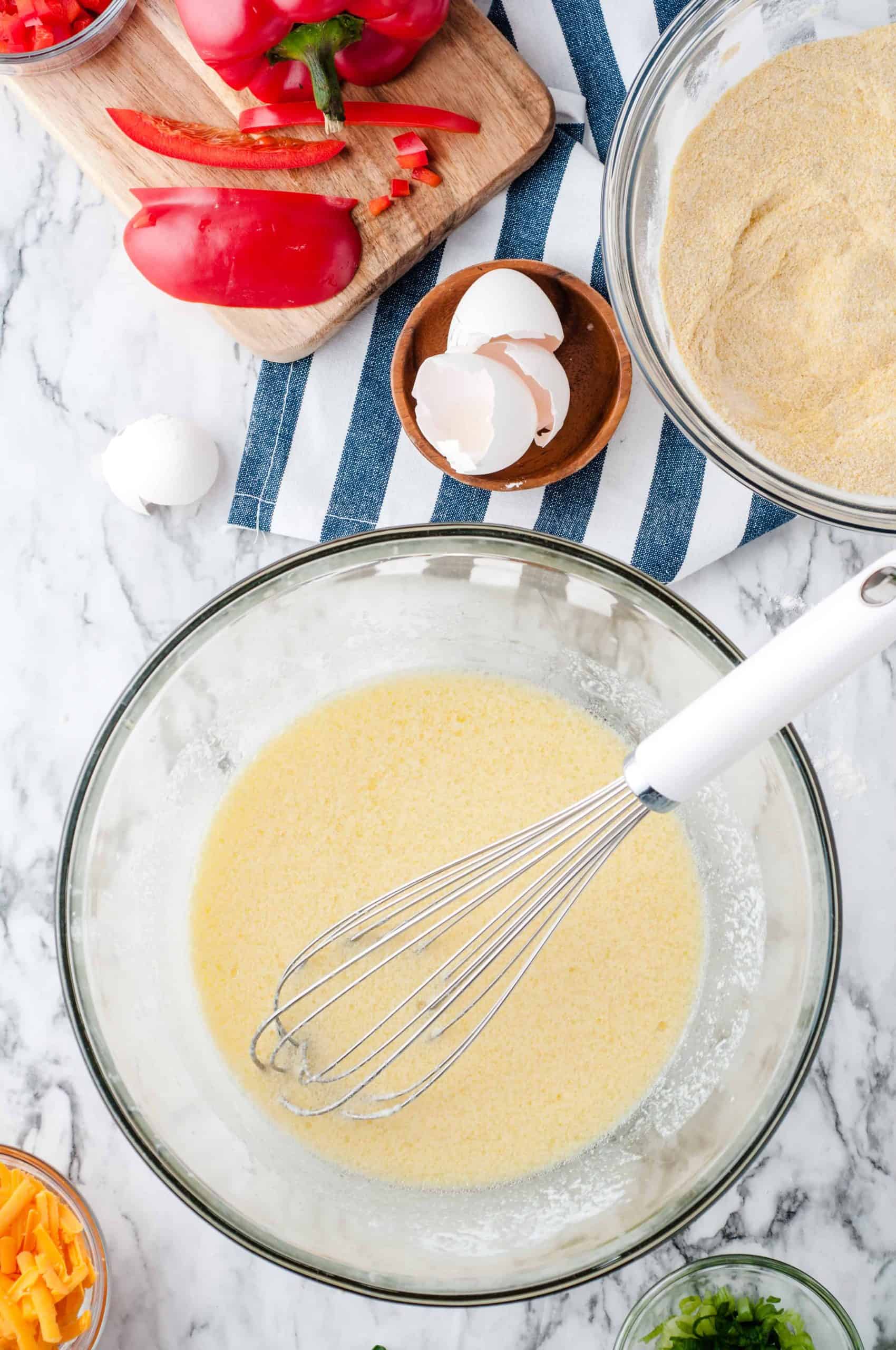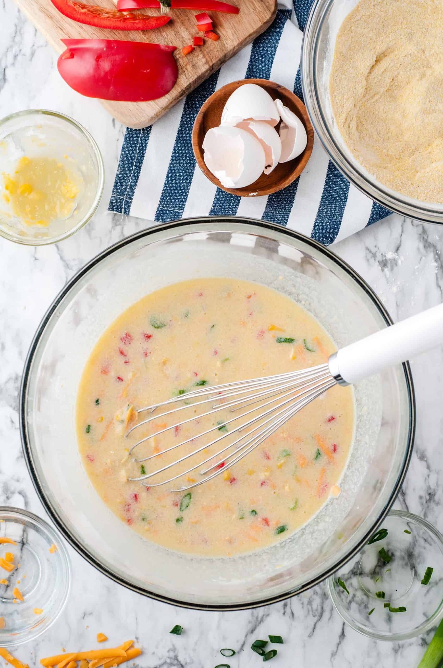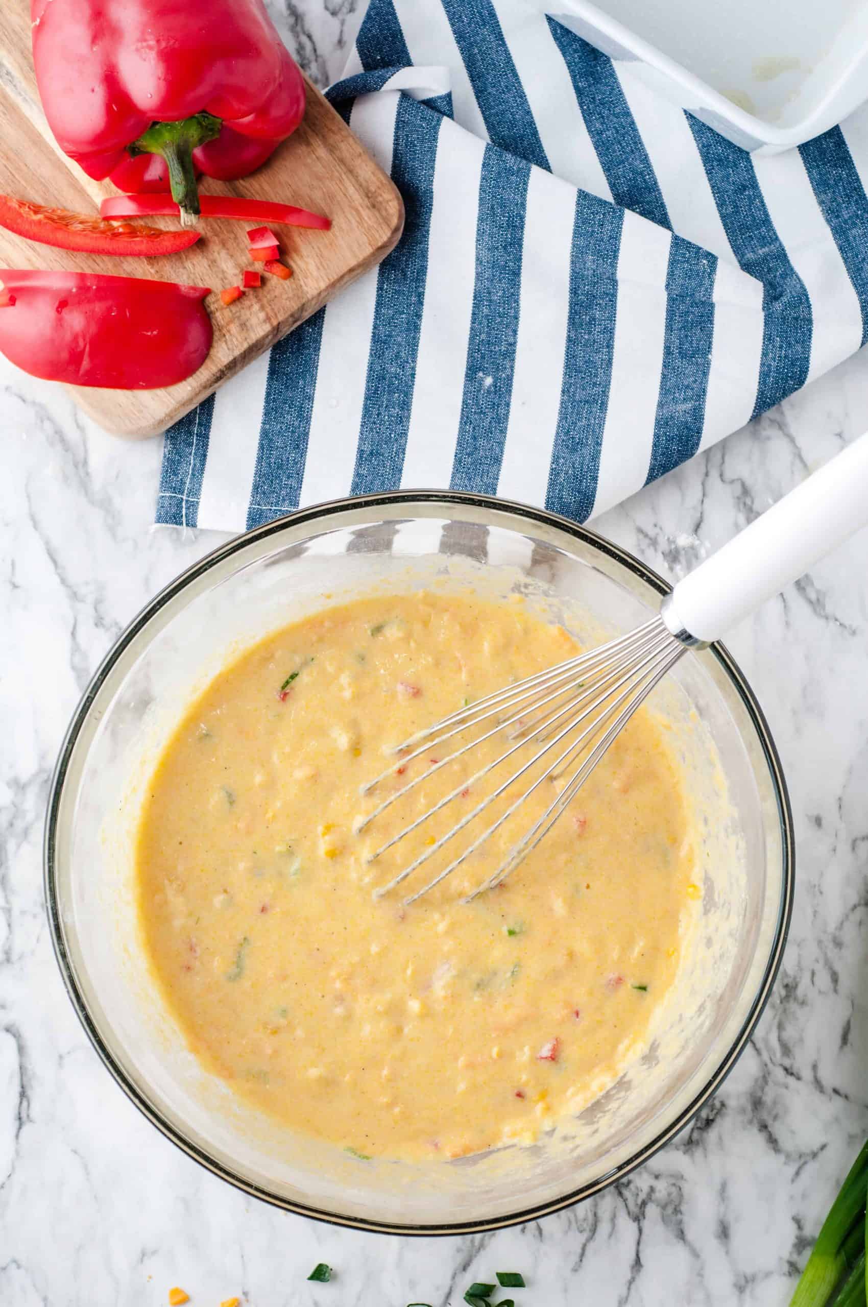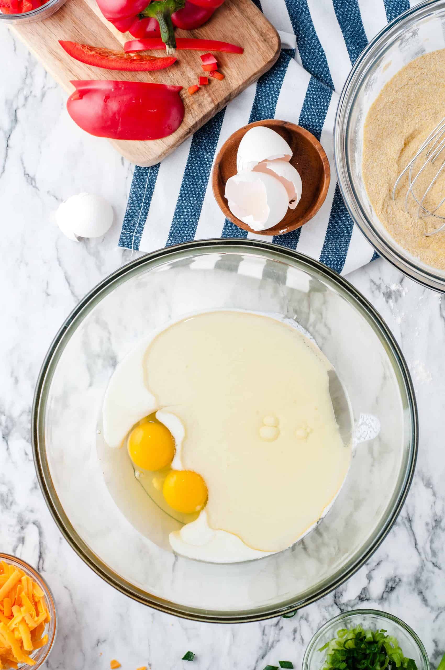 Step 2: In a large bowl, mix together the eggs, buttermilk and vegetable oil. Stir in the creamed corn, green onion, red pepper and cheese.