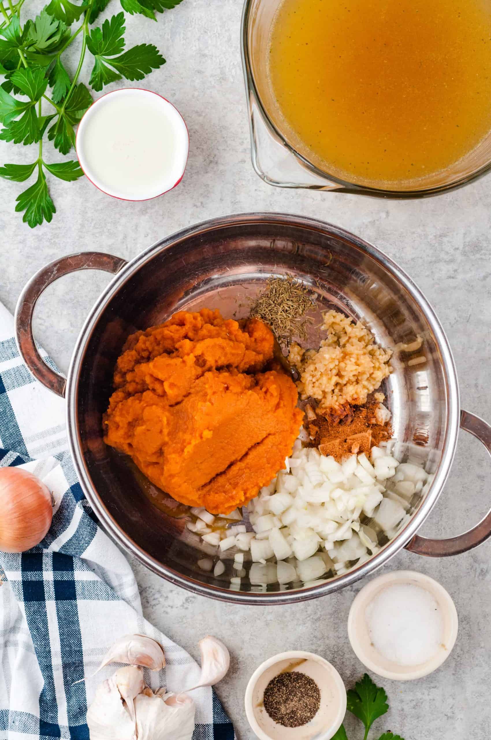 - In a large pot, combine the vegetable stock, pumpkin puree, onion, garlic, thyme, and nutmeg.