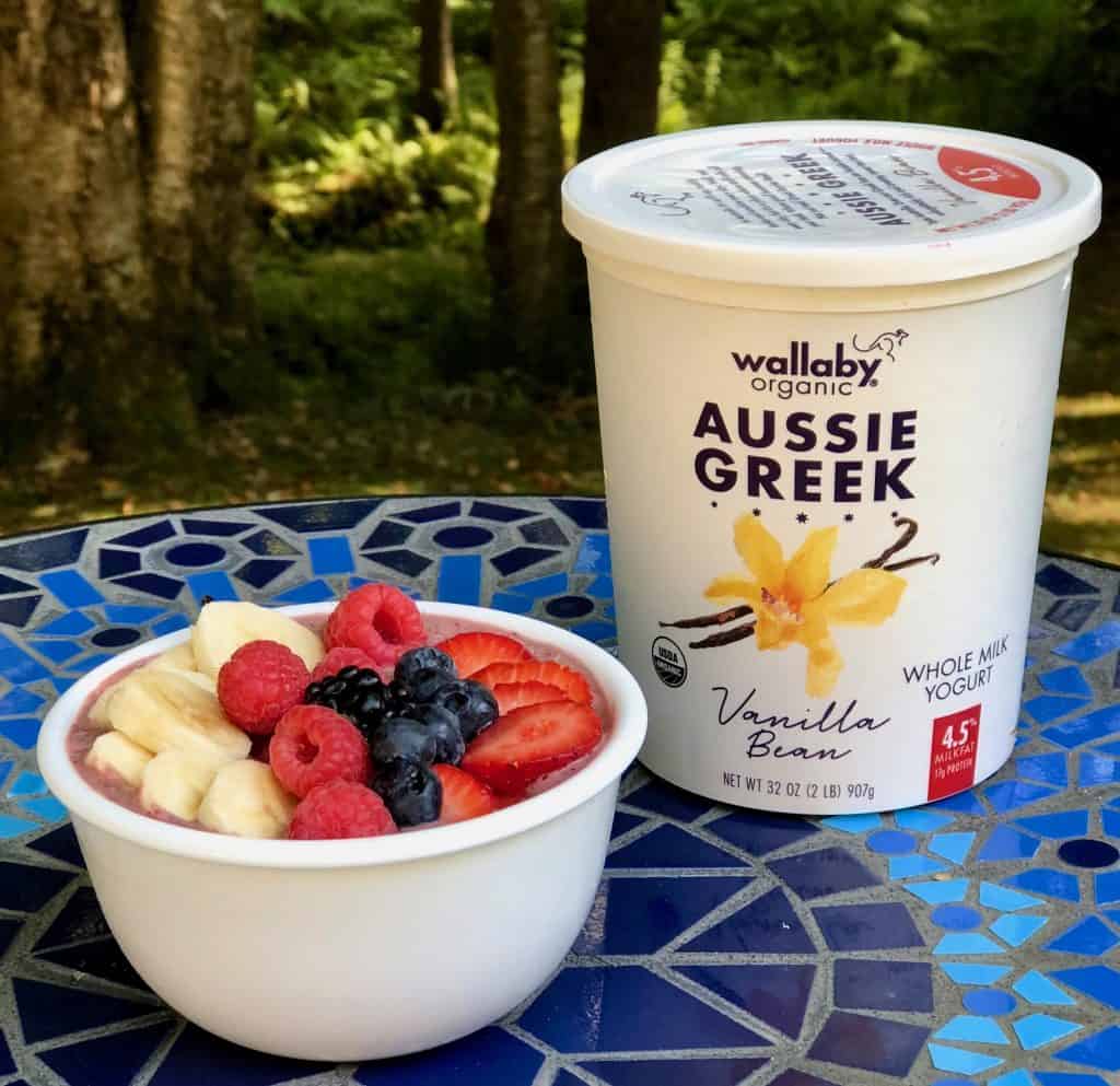 One of my favorite ways to enjoy a quick and easy breakfast for myself and my children is by eating Wallaby Organic Greek Yogurt or drinking Wallaby Organic Kefir. The delicious whole milk Aussie Greek yogurt is produced in small batches and made with premium organic ingredients. I noticed a pleasant difference in taste the first time I tried Wallaby Organic Greek Yogurt. The flavor is mild, yet decadent! I pack it every day in my kid's lunch boxes for school too . My daughter's favorite is the Aussie Greek Vanilla Bean and she adds fresh berries to it for a special treat. My son prefers the Aussie Greek Blueberry all by itself. I love eating it all by itself too, but I also enjoy making smoothies and smoothie bowls with it. Check out my favorite smoothie bowl recipe using Wallaby Organic Aussie Greek Vanilla Bean Yogurt. It is perfect for breakfast or anytime of the day!
