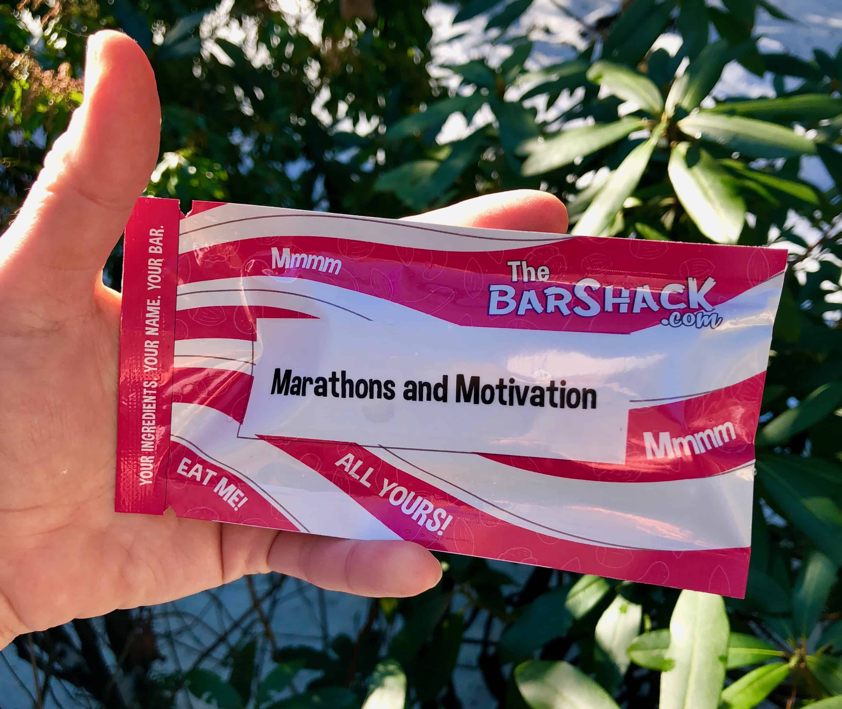 Recently, I discovered these fabulous protein bars from The Bar Shack. They are custom made gourmet bars that you can choose your ingredients. So, you literally get to select what ingredients are going to go into the bar you order. Start off with the base, I opted for Soft & Datey. Then, choose the Nuts &/or Seeds, I love almond butter so that was my pick. Next up, you get choose several other things to add to the bar, such as dried fruit, protein powders, flours, flavor oils, and flavor & texture enhancers. This is what my delicious bar includes: Dates, Roasted Almond Butter, Coconut Flour, Chocolate Chips, Tart Cherries, Coconut Oil, Pistachios, Cashews, Toasted Coconut, Maca, Bee Pollen Powder, Blueberries, & Sea Salt...WOW!!! That is a lot of stuff to pack into a bar and it is so delicious!! So...it is so awesome to choose all your ingredients, but what is even more fun is choosing the name of your bar!! I went with Marathons and Motivation of course! Check it out: