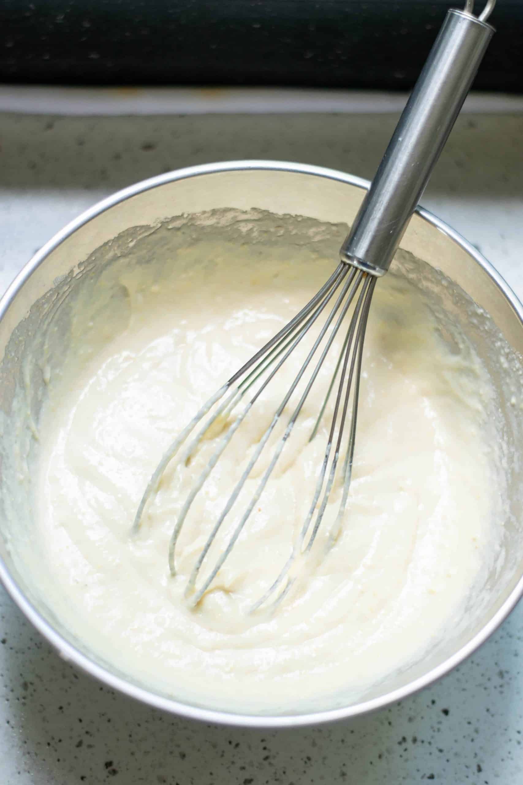 In a large bowl, add the gluten-free flour, baking powder and a pinch of salt. Use a whisk to combine the ingredients together.