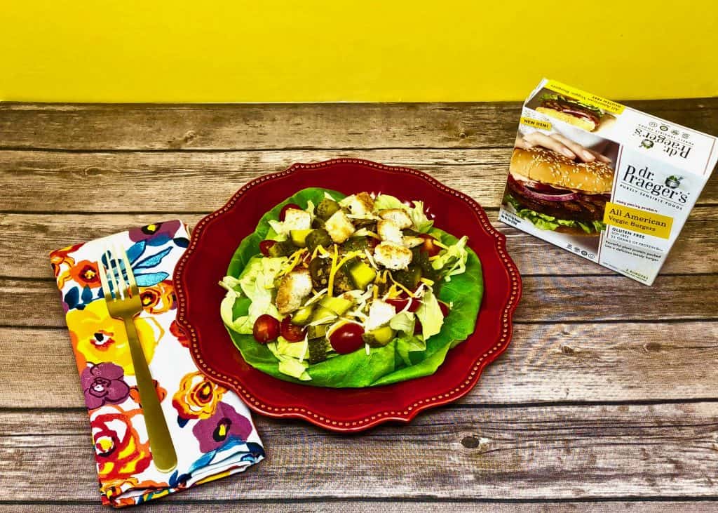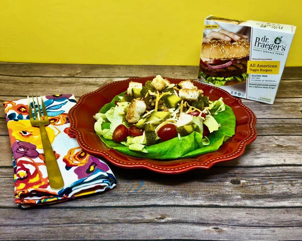 I recently discovered Dr. Praeger's All American Veggie Burgers in the freezer section at our grocery store. I have been a long time fan of veggie burgers, but the Dr. Praeger's brand caught my eye as they are gluten free, soy free, kosher, and vegan. They also have the Non-GMO Project Verification and each burger is packed with 25 grams of protein. Most importantly, they taste fabulous! They are the perfect ingredient for my Gluten Free Veggie Burger Salad with the Works!