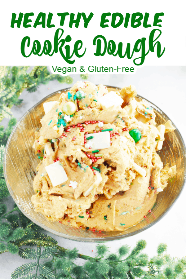 This Healthy Edible Cookie Dough recipe is quick and easy to make. It is vegan and gluten-free making it a fun and allergy friendly treat for everyone to enjoy! I have added in holiday inspired sprinkles here, but they can be left out or changed up for different seasons.