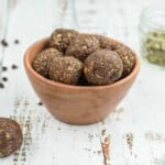These Healthy No-Bake Peanut Butter Crunch Balls are a simple, tasty snack to make. They are a combination of 8 nutrient dense ingredients including: pumpkin seeds, flax seeds, dates, peanut butter, chia seeds, cinnamon, sea salt and chocolate chips. The sweet and salty bites are a great way to refuel after a hard workout. Kids love these delicious treats as a snack too!