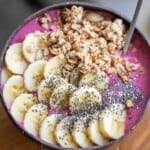 Add anything your heart desires! Other ingredients that I like to add on top of the Healthy Pink Smoothie Bowl include: shredded coconut, sliced strawberries, pomegranate seeds and kiwi slices.