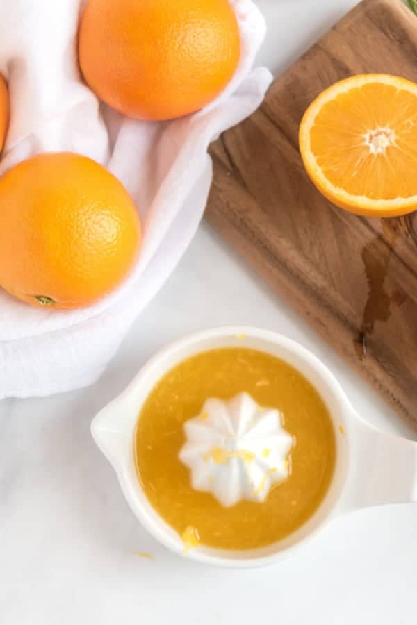 Cut the oranges in half and press them over a juicer. Then, remove any of the seeds. If you do not like pulp in your juice, pour it over a mesh strainer with a large bowl underneath of it.
