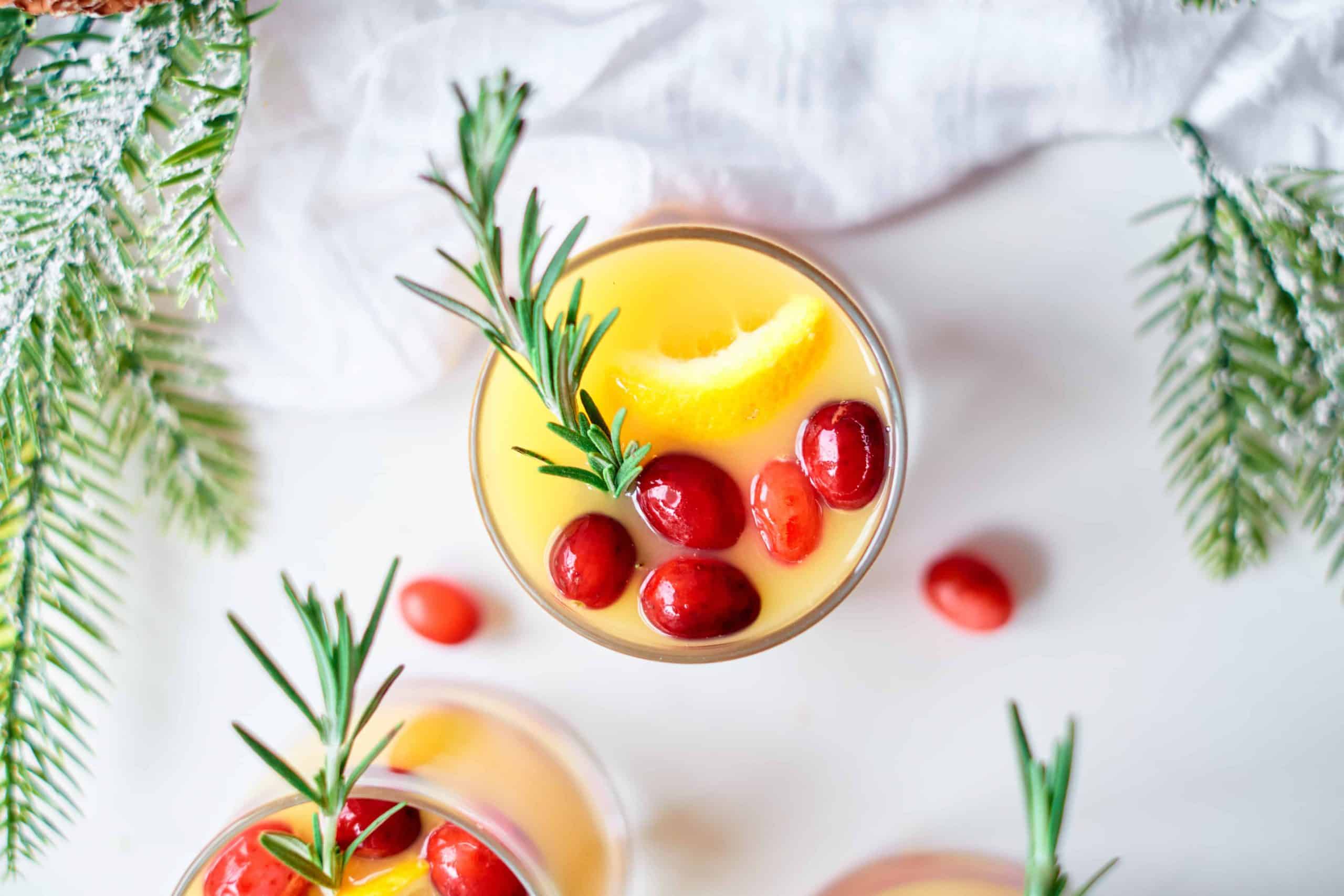 Pour freshly squeezed orange juice evenly into 4 glasses and top with sparkling cider or non-alcoholic champagne.  Add in fresh cranberries and garnish with a sprig of fresh rosemary.  That is all there is to it!