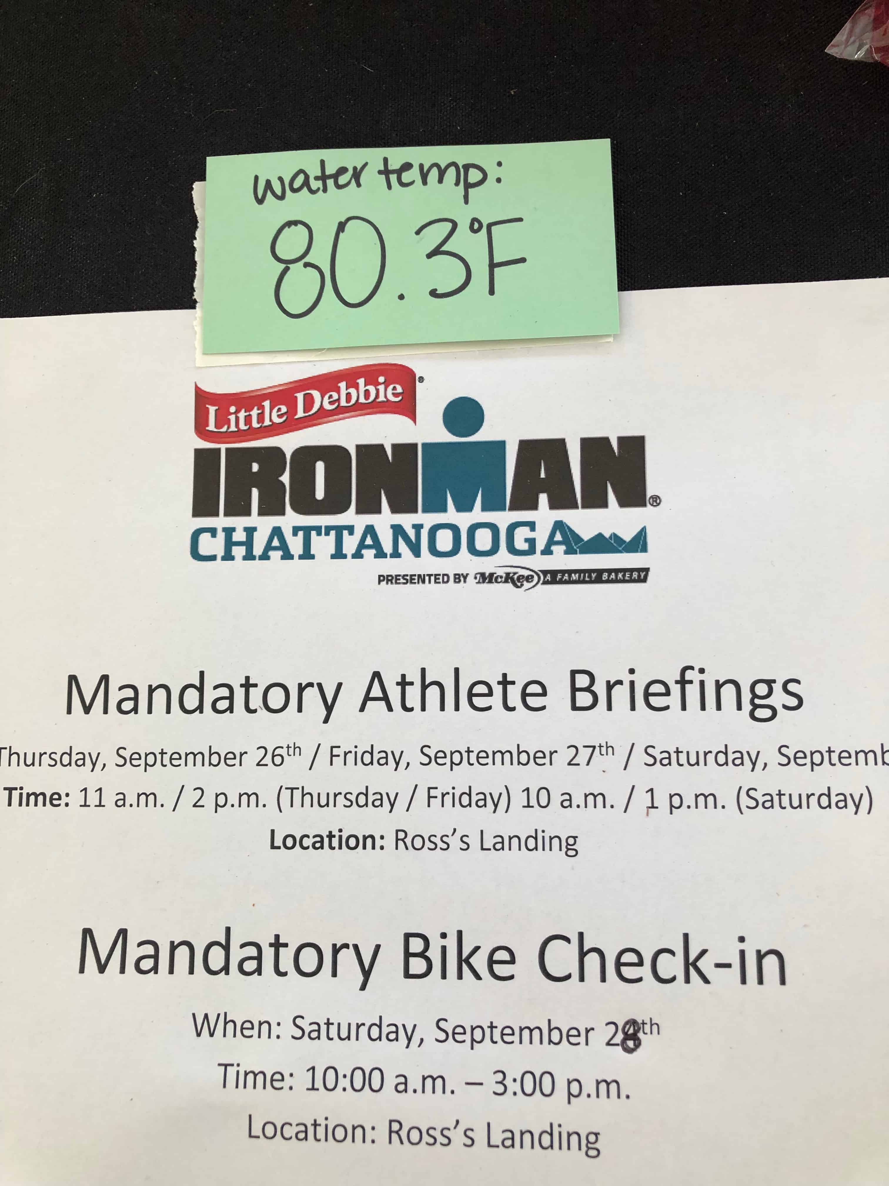 Once we got settled into our hotel room at the Hampton Inn in downtown Chattanooga, we walked down to the race expo. I was surprised at how few people were there on Thursday and there was no line at the athlete check-in. I signed the waivers, turned them in and got my bracelet. One of the amazing volunteers reviewed the course information with me. He pointed out that the water temperature was 80 degrees and the swim would be "wetsuit optional". However, they were strongly encouraging people to not wear them as the temperature was going to be so hot on race day.