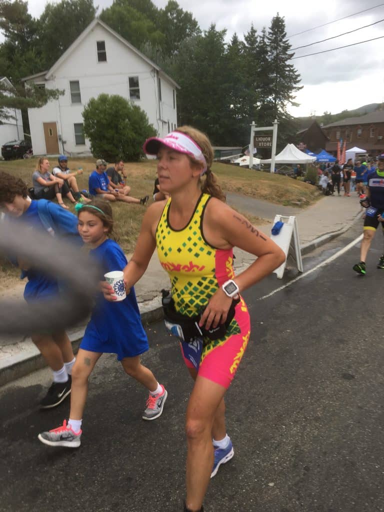 I made my way through town and down the giant hill that I would later be crawling back up. My legs were moving and I was just trying to focus. I came to the first aid station where my family was volunteering and I was so thrilled to see them! My kids and husband were manning the water area of the station, so I stopped and gave everyone a big hug and they walked with me for a bit while I drank my water and talked a little bit about my ride. Then, my son told me how he was strategically able to hold 4 cups of water at a time to pass to runners. I laughed and told them how thankful I was that they were there to help everyone! Next, I told my husband that I was not feeling well and he told me to "just stick with your plan, you're doing great!" Then, I was off and started running again, but I was seriously not feeling well.