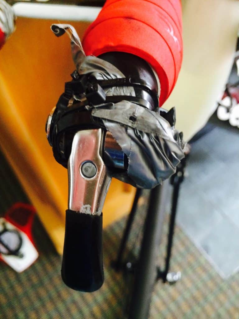 I got back on my bike and continued riding, but quickly realized just how hard it was going to be as I headed up the first hill without any easy gears. I grinded my way to the stop standing on my bike, when one of the Pros passed me and yelled "Use your gears!" I yelled back "I don't have any!!" I wanted to cry, I was so angry and just could not believe that this was happening. I made it to the top of that hill and my legs were on fire, then flew down the back side to be faced with another very steep incline. I noticed a person off their bike walking up it and I decided to do the same. I saw a different bike mechanic drive by and I thought I'm going to flag him down when I see him come back around the loop. I hopped back on my bike at the top of the hill and saw him and waved frantically for him to stop and help. He stopped and initially told me the same thing the first mechanic did...it was a special part that they could not just "get" on race day. Then he said, "let me think for a minute" as he grabbed a backpack full of odds and ends. He said, "I have an idea!" He took some plastic ties and began to slowly create the piece that was missing on my shifter with them, then he duct taped them together and added more plastic ties on top to secure it. We tested it and it worked!! It did not give me all my gears, but at least I had the middle range to use. I knew it would still be hard, but I needed to do all I could do to get to the finish line! I thanked him profusely and he reminded me to not shift too high up or too low down as it could break the plastic ties.