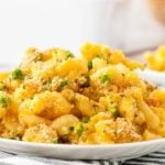 This Mac and Cheese with Gouda Casserole is an upscale version of the classic comfort food dish. A creamy sauce is made from gouda and cheddar cheese, then poured on top of the macaroni. Green peas are added to the dish for a contrast in flavor and to sneak in some veggies! The macaroni and cheese casserole is then topped with parmesan cheese and bread crumbs and baked in the oven until a lightly browned and crunchy. The dish is a family favorite for Sunday Supper. It is also a terrific dish to take to a potluck party.
