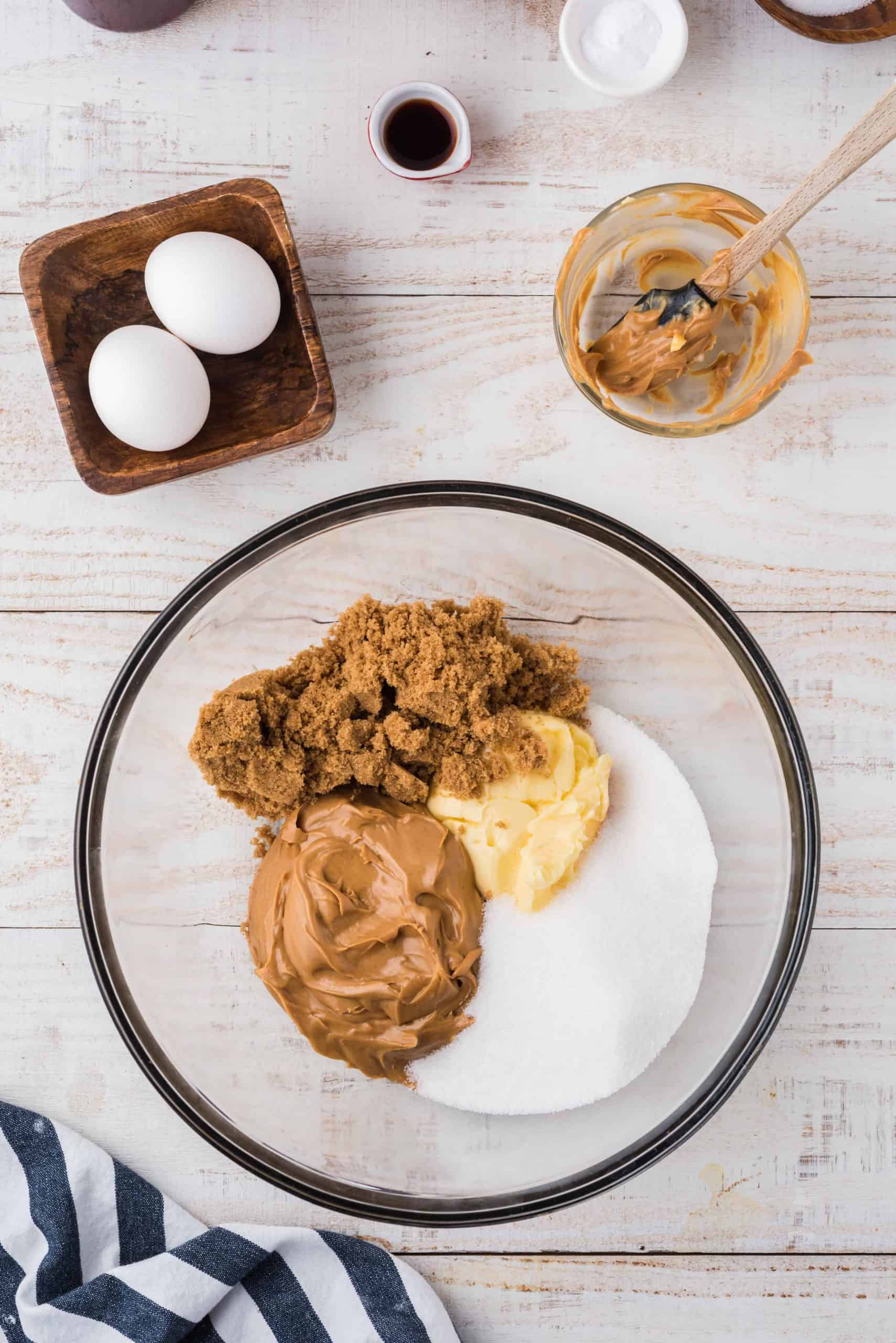- In a large bowl, with an electric mixer, cream together the white sugar, brown sugar, butter and peanut butter.