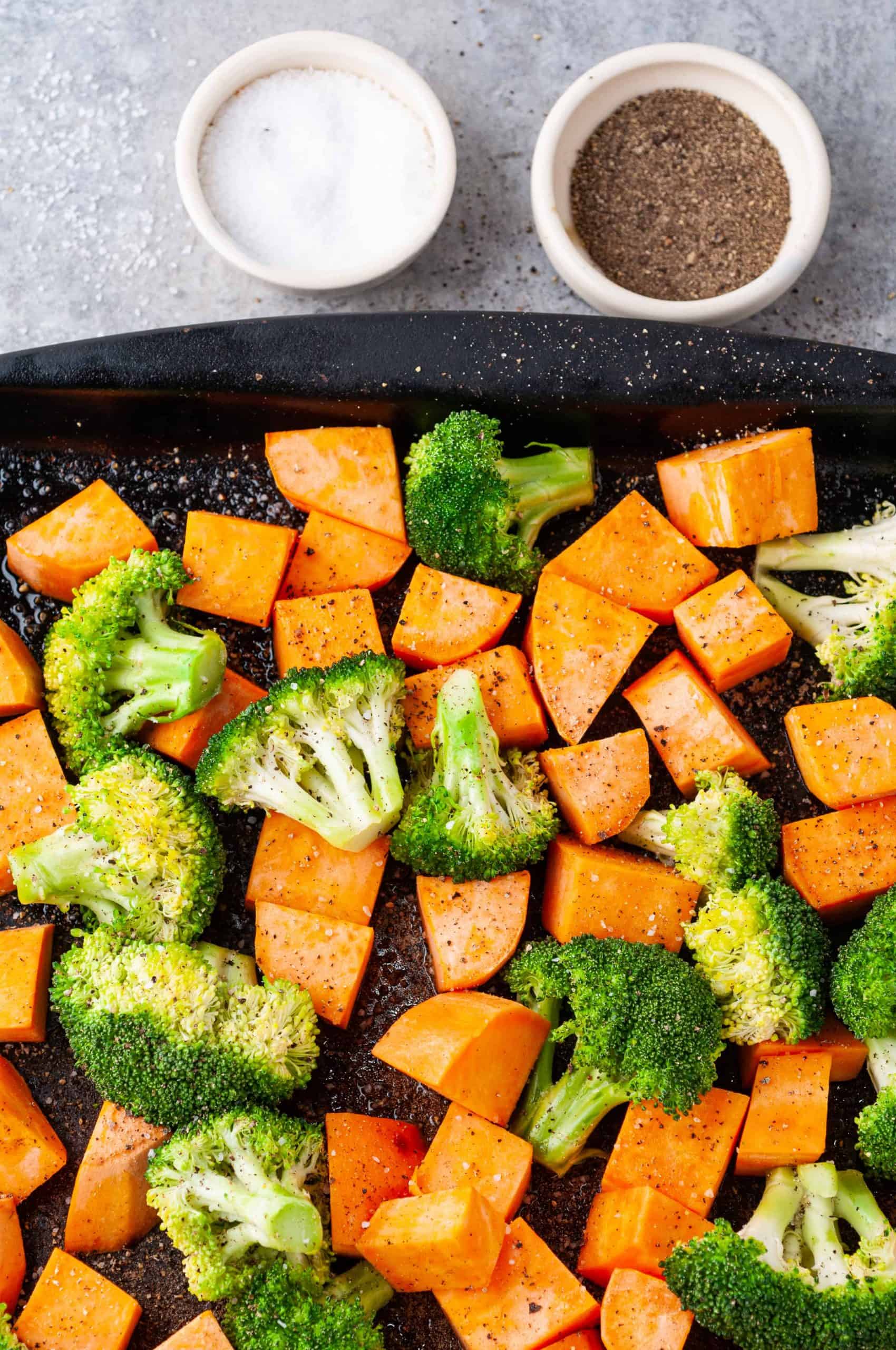 - Peel sweet potatoes and cut into ¾ inch cubes, then cut broccoli crowns into florets and spread on the baking sheet