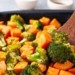 Place back in the oven and roast for an additional 15 to 20 minutes. Remove from oven when the broccoli and sweet potatoes begin to crisp and lightly brown. Serve warm and enjoy!