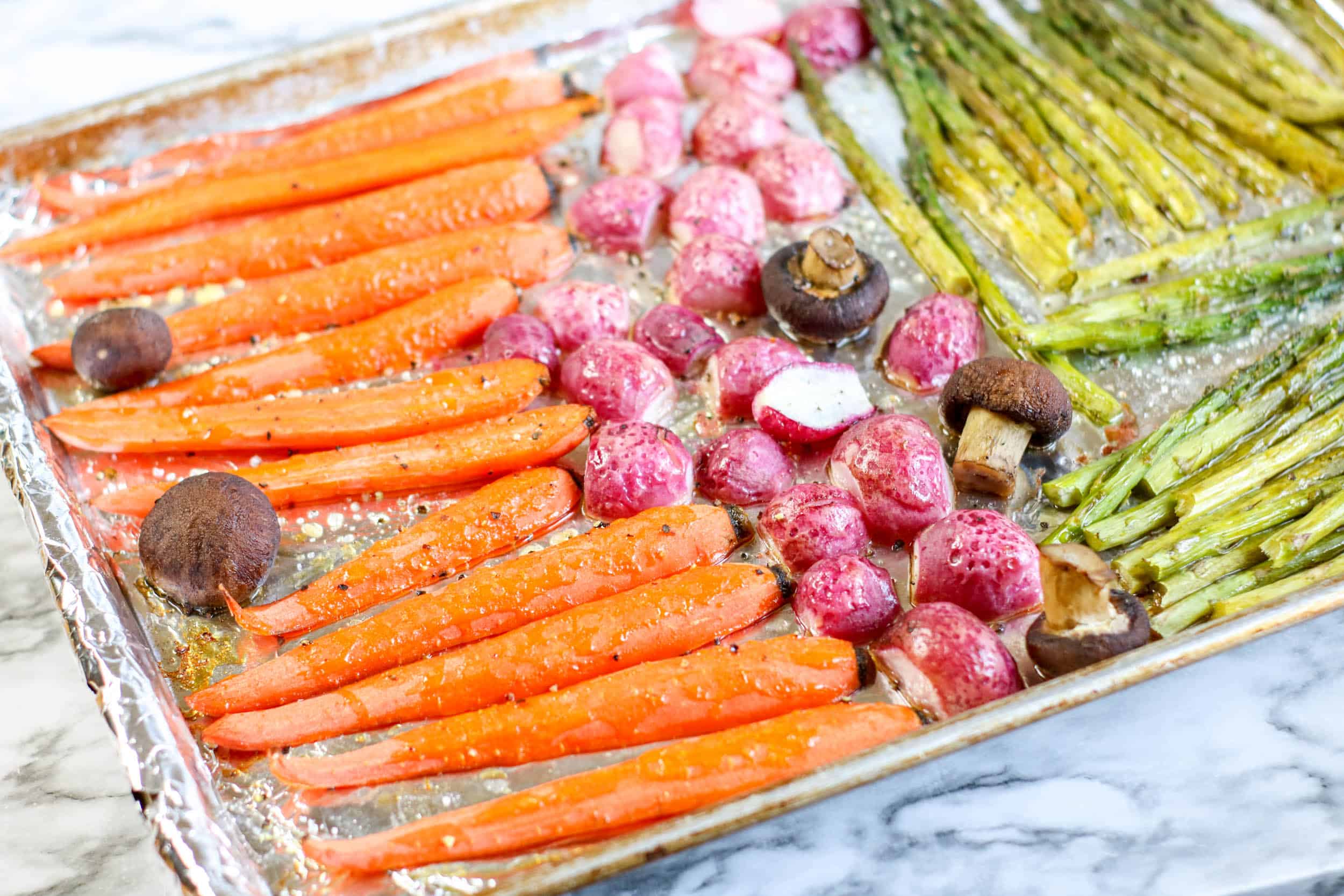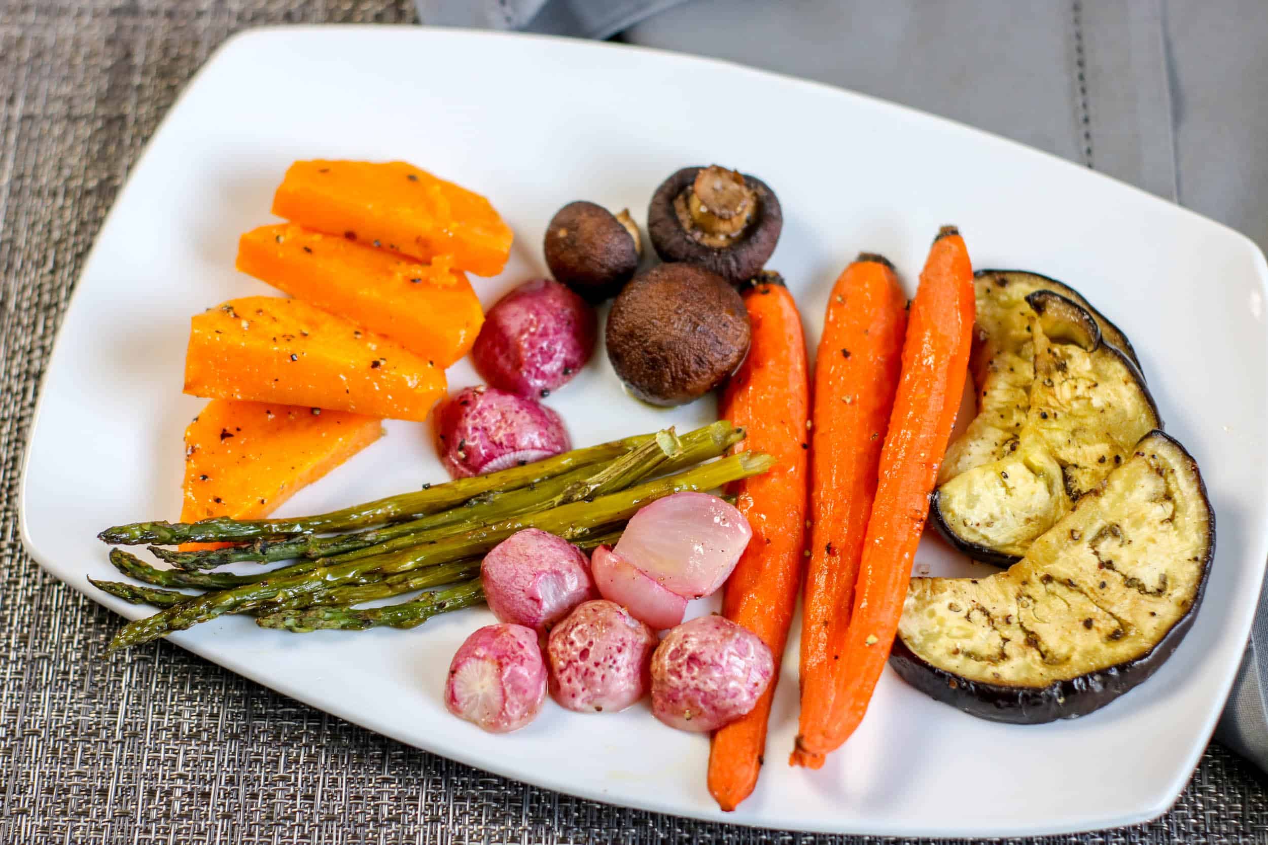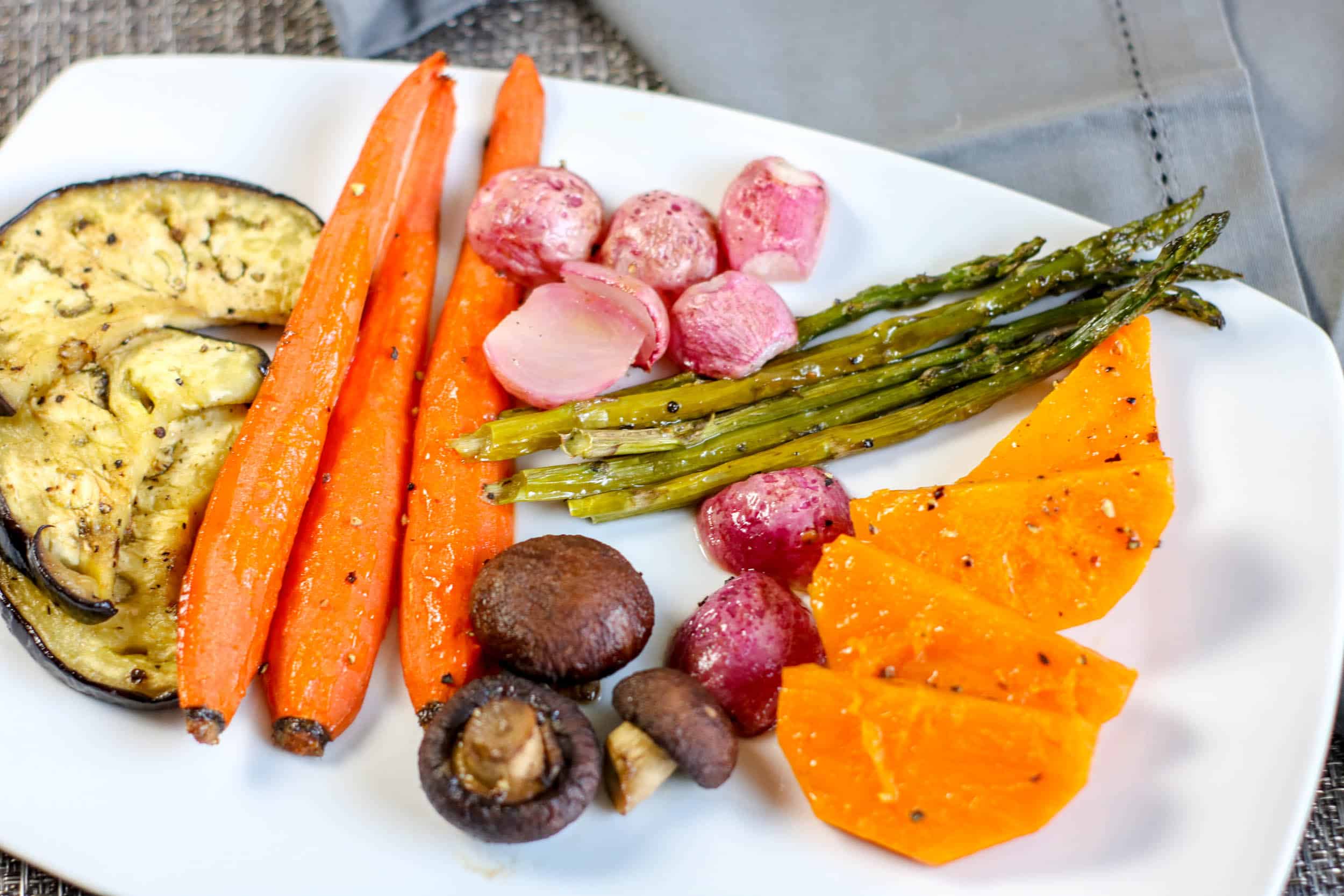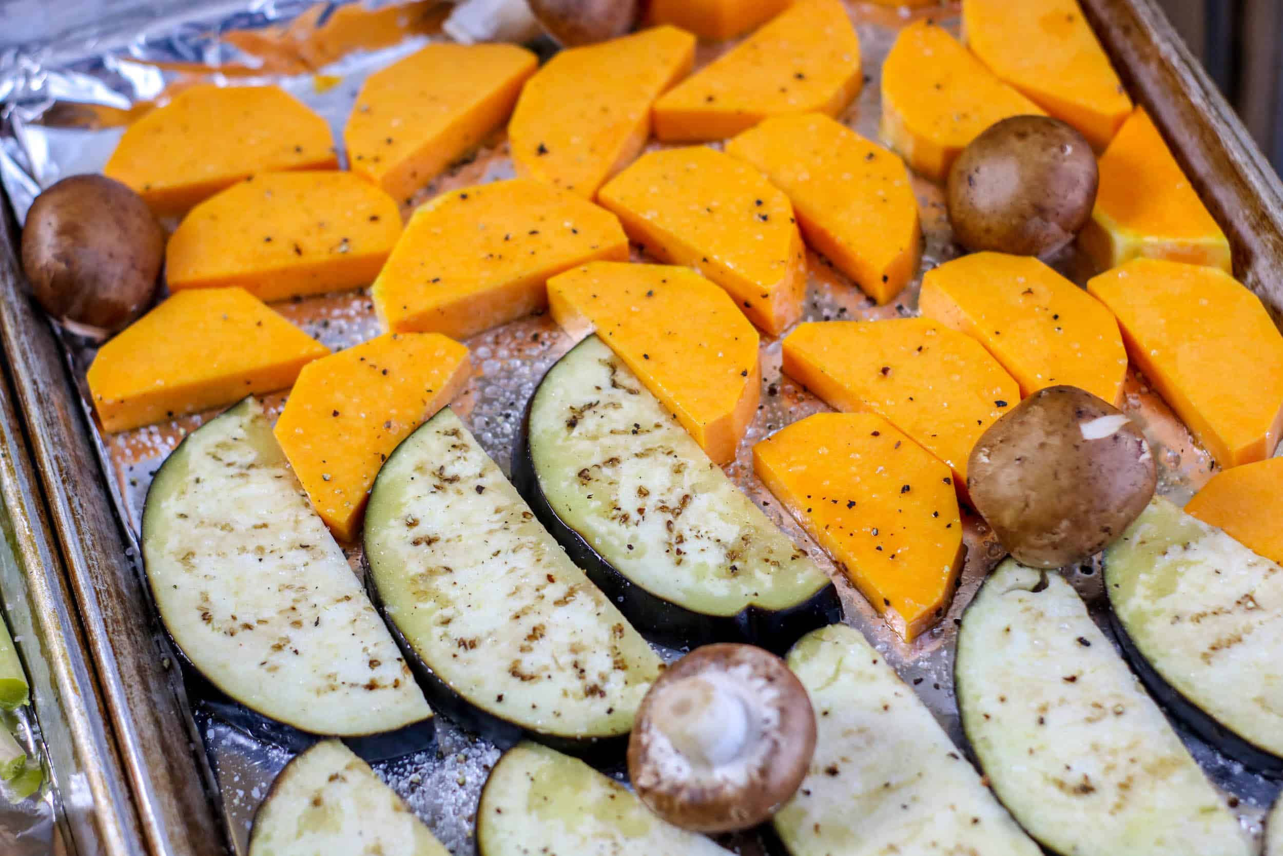 Make sure to allow a little room in between veggies so they are able to roast and not steam. I used to separate baking sheets for all of the vegetables. I placed the peeled and sliced butternut squash, eggplant pieces and whole mushrooms on one. Then, I added the asparagus with the tough ends removed, radishes with stems and roots removed, peeled carrots and a few mushrooms to the other one.