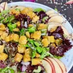 - In a bowl place sautéed squash, quinoa, chopped red onion, celery, agave syrup, pinch of pepper, sliced apple, lettuce and arugula. Drizzle enough dressing in to lightly coat the salad and toss to combine.