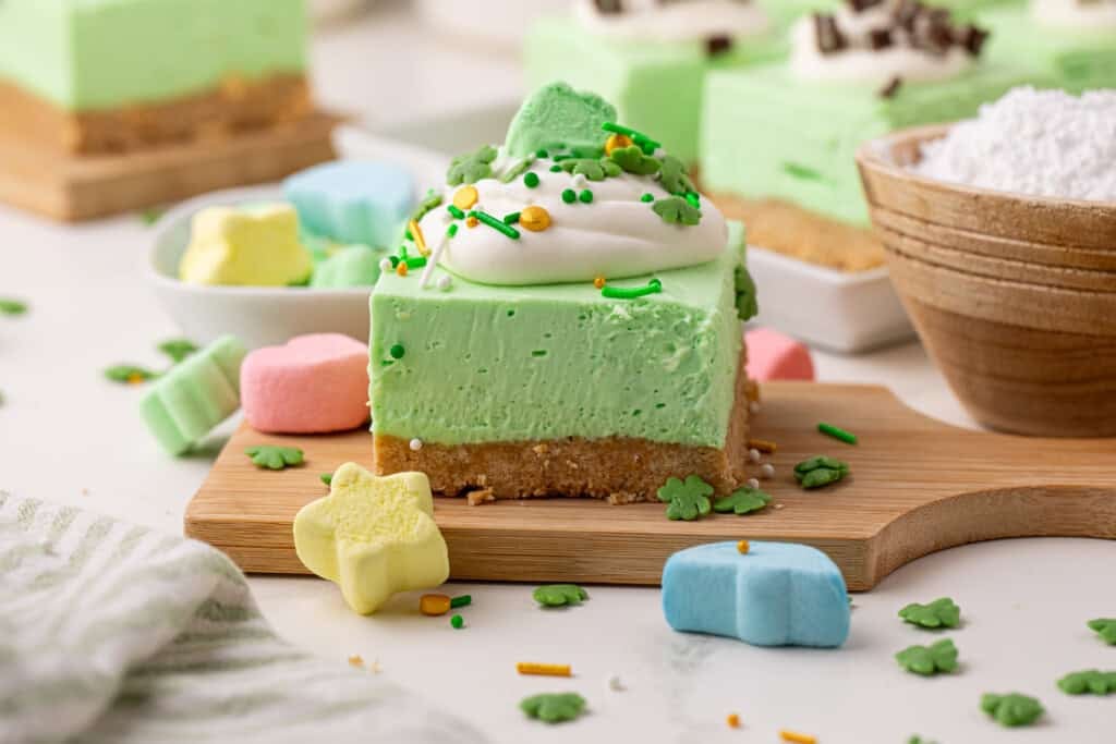 More garnish ideas: Beyond the options listed, try mini mint chocolate chips, dark or white chocolate drizzle, crushed Thin Mints, shamrock-shaped sprinkles, gold or green sanding sugar, rainbow sprinkles, edible gold leaf flakes, fresh mint leaves, or a maraschino cherry on each bar for that classic shake look. If using sanding sugar, sprinkle it on just before serving so it doesn't melt into the cheesecake and discolor the bars.