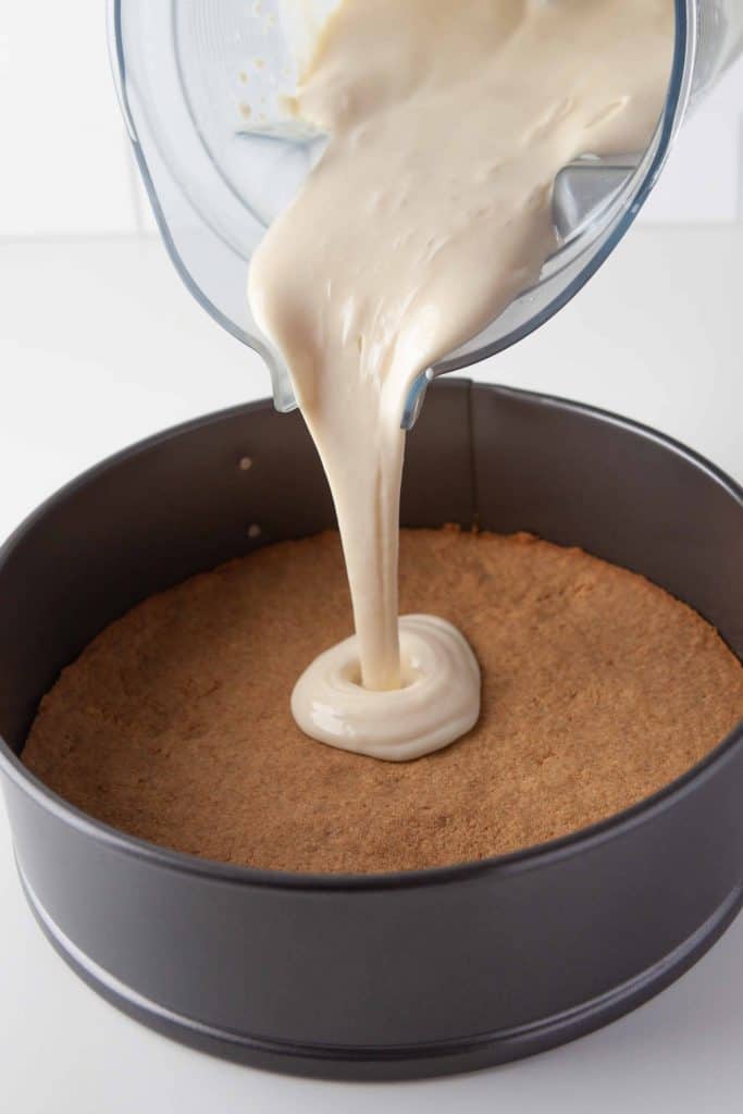 Transfer the graham cracker mixture to your springform pan. Press the crumbs into the bottom of the pan and up the sides until firm. Bake the crust for 8 to 10 minutes, until it's golden brown.