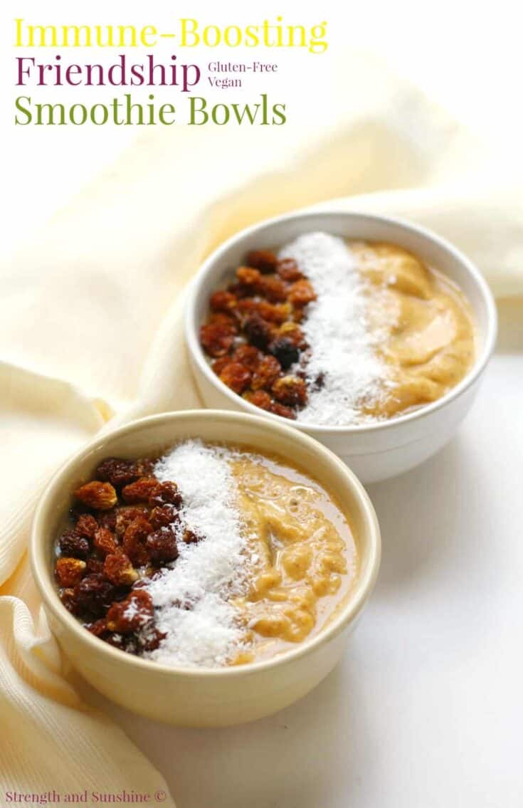 Immune-Boosting Smoothie Bowls These cold-busting, easy Healthy Vegan Immune-Boosting Smoothie Bowls are packed with vitamin and antioxidant-rich fruits, veggies, turmeric, ginger, chia seeds, and apple cider vinegar to keep away germs and illness! Topped with coconut and golden berries, your immune system will be in tip-top shape!