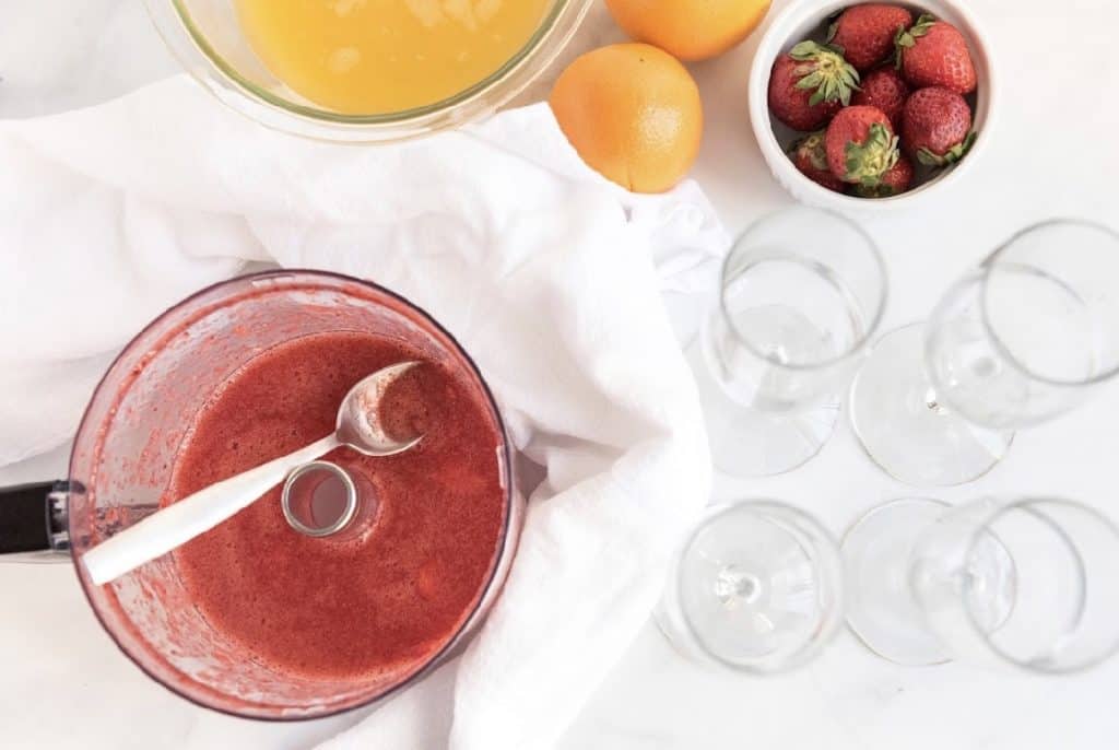 This strawberry mimosa recipe is made with fresh squeezed orange juice and pureed strawberries. It is a delicious and festive drink perfect for Sunday brunch or any holiday. It can be made with champagne or as a mocktail with non-alcoholic champagne or sparkling cider.
