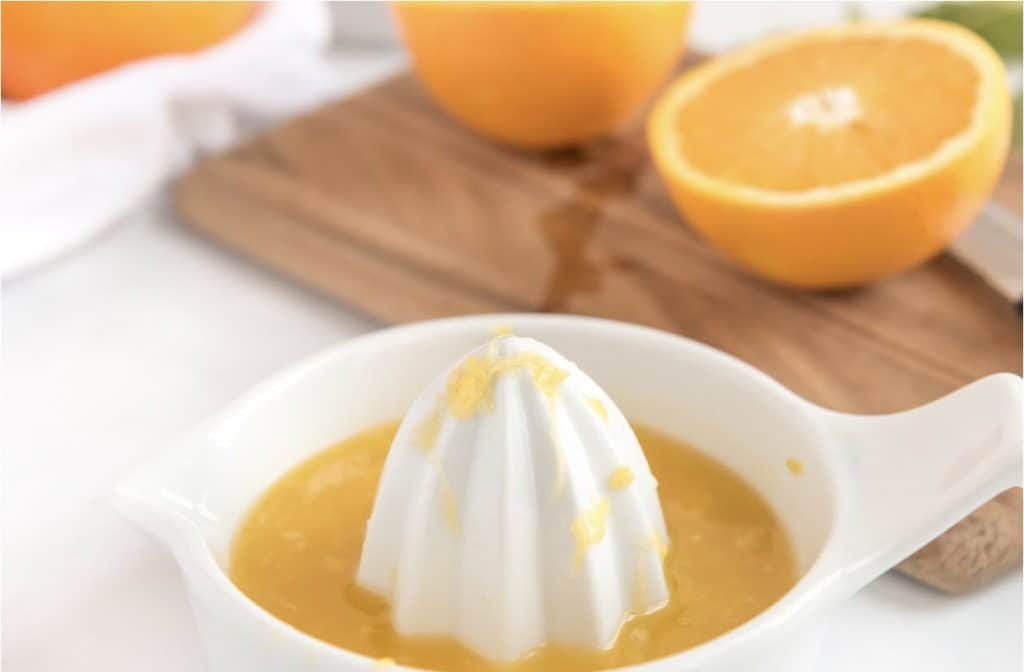 - Cut oranges in half and press over an orange juicer. Then, remove any seeds.