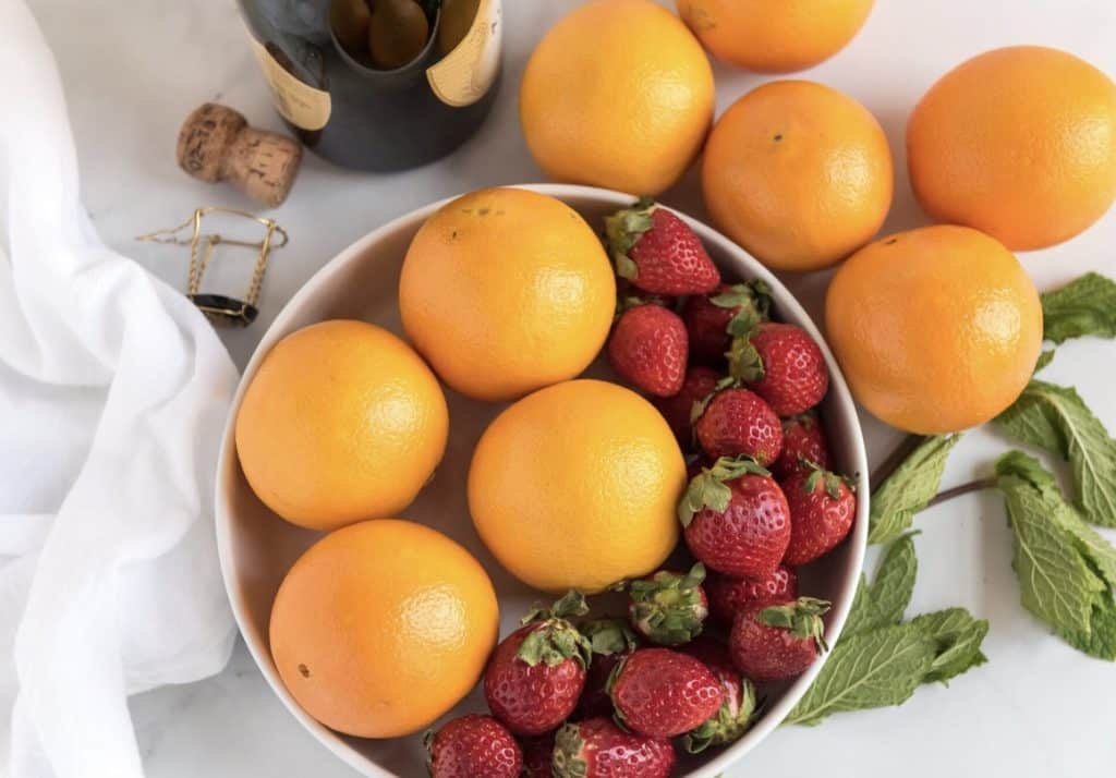 I used half of a strawberry and cut a slit in it to place on the edges of the flutes.Then, I added a small piece of orange and 2 mint leaves. However, you can use anything that you like or nothing at all! These strawberry mimosas are beautiful all on their own.