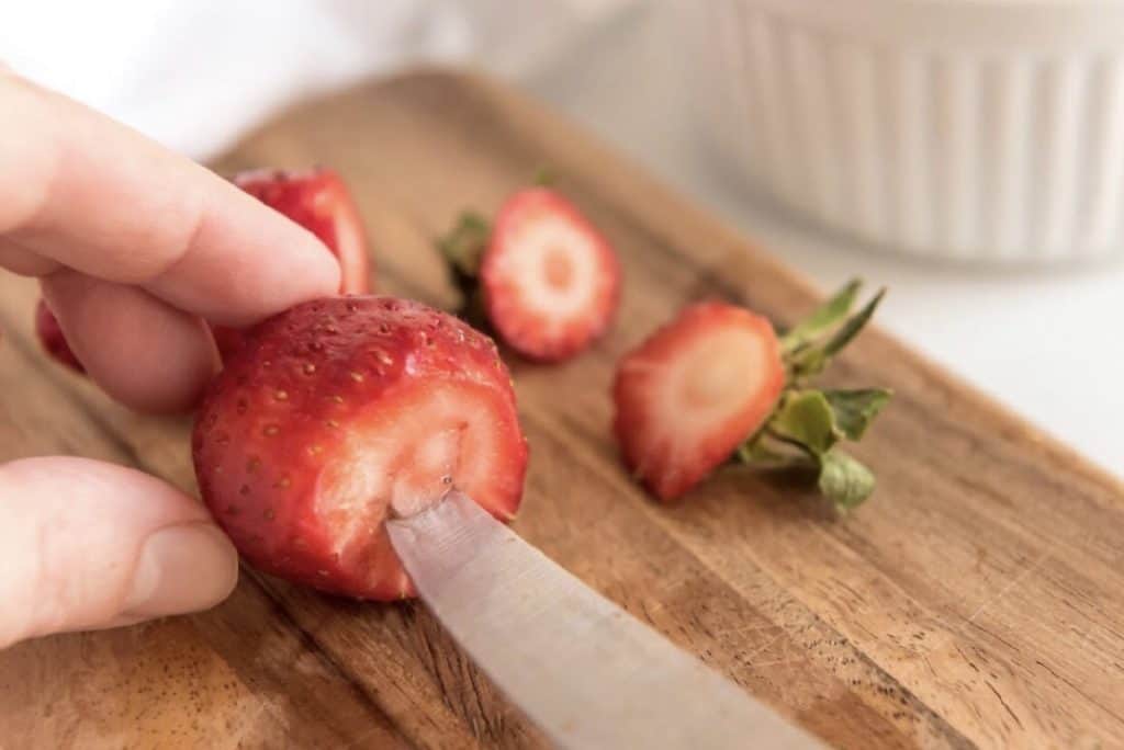 Then, remove any seeds and set juice aside. If you do not like pulp in your juice, pour it over a fine mesh strainer with a large bowl underneath of it.Next, wash and dry the strawberries. Cut the tops off of the berries and hull the insides.