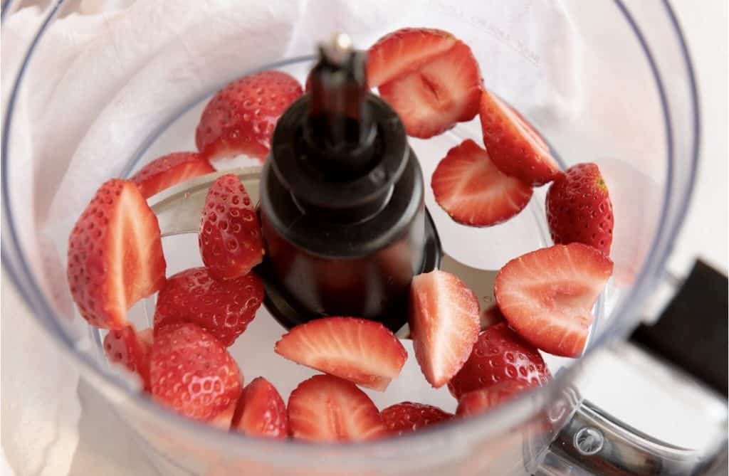 Chop the strawberries in half and place them in a food processor or blender. At this point, you can add a little sugar if desired for extra sweetness. Pulse the strawberries at first.