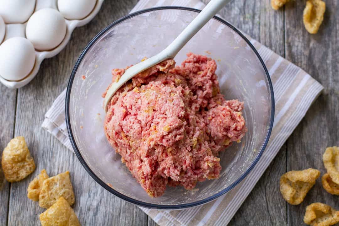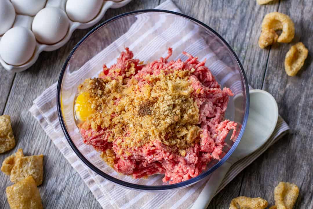 - In a large bowl, add ground beef, crush pork rinds, 1 teaspoon of salt, spices, egg, and 2 tablespoons of heavy cream Gently fold ingredients together.