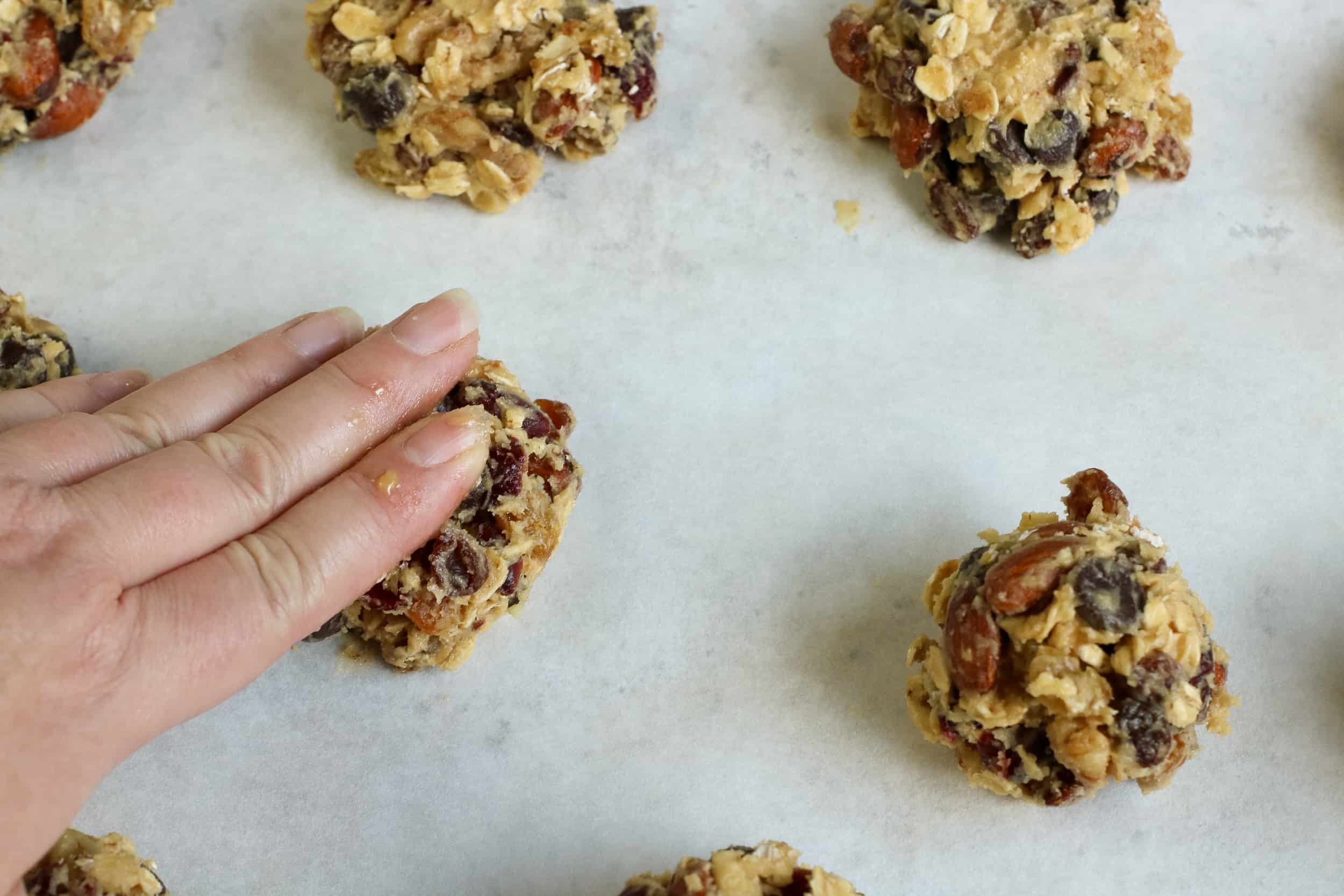 - Using a damp hand, press the cookies to about 1 inch thickness. (Be aware that the cookies will spread slightly when baking.)
