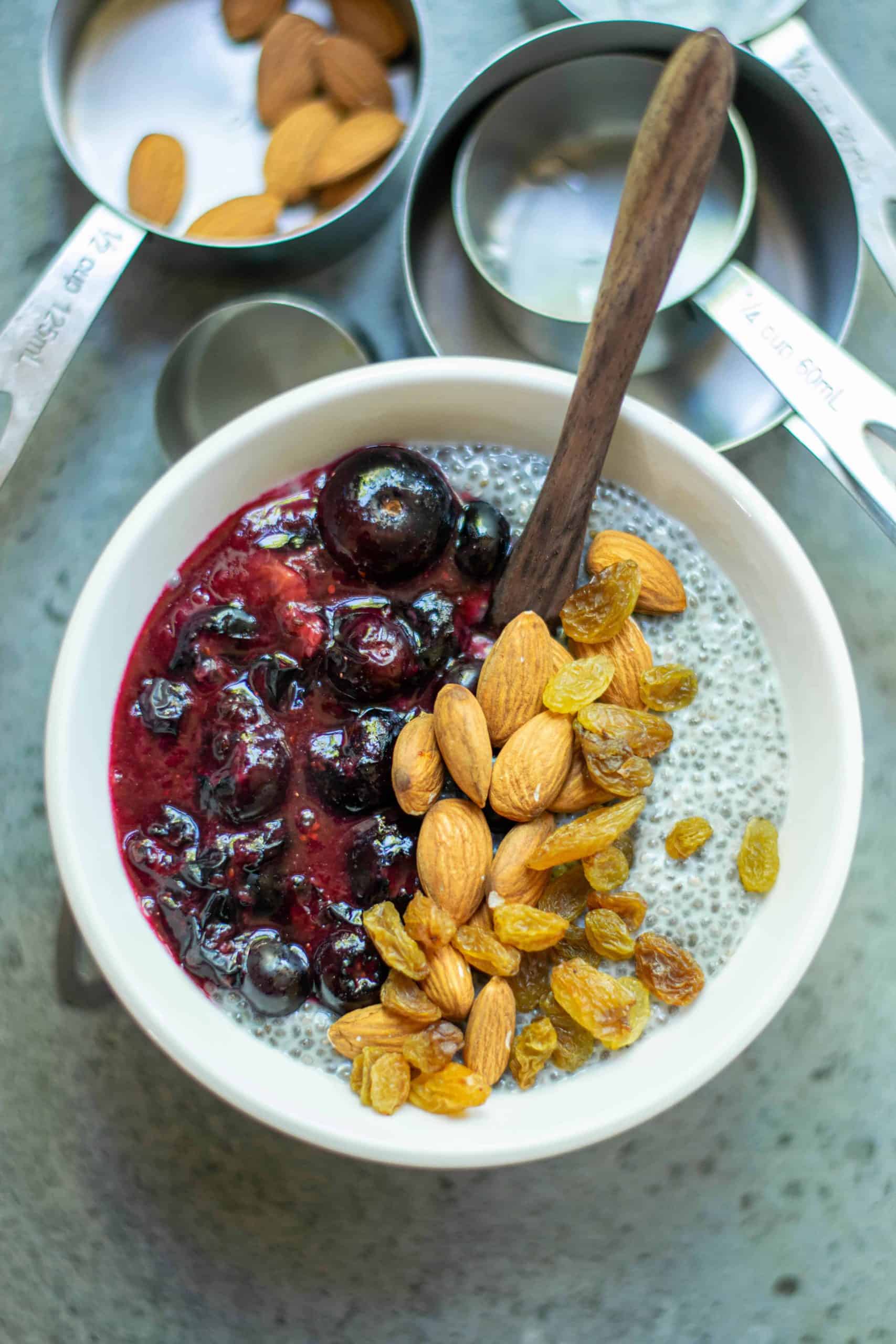 - Divide the Chia Pudding between two serving bowls. Then top with caramelized blueberries, almonds and raisins. Serve immediately and enjoy!