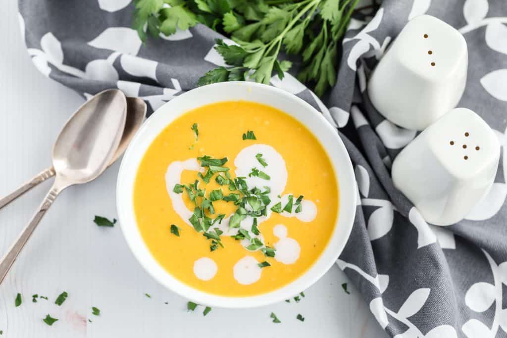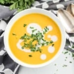 I love this soup recipe because it is so easy to make! The hardest part is actually peeling and cutting up the butternut squash. However, many grocery stores have started selling it peeled and cut into chunks. So, when time is limited, I often buy it this way.